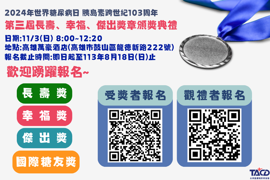 2024年世界糖尿病日,由衛生福利部國民健康署指導,台灣基層糖尿病協會與財團法人糖尿病關懷基金會主辦,「第三屆長壽、幸福、傑出獎章頒獎典禮」開放報名!名額有限、額滿為止,歡迎大家踴躍報名。