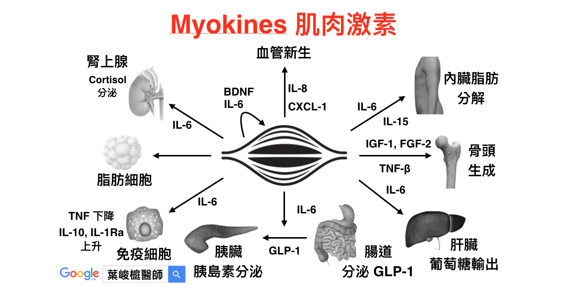 很多研究指出, Myokines 具備了自分泌 (Autocrine), 旁分泌 (Paracrine),還有內分泌 (Endocrine)的效果。運動時,肌肉會收縮並分泌 Myokines,去影響其他器官,如骨頭、胰臟、腸道、肝臟、白色脂肪組織、棕色脂肪組織跟腦等。