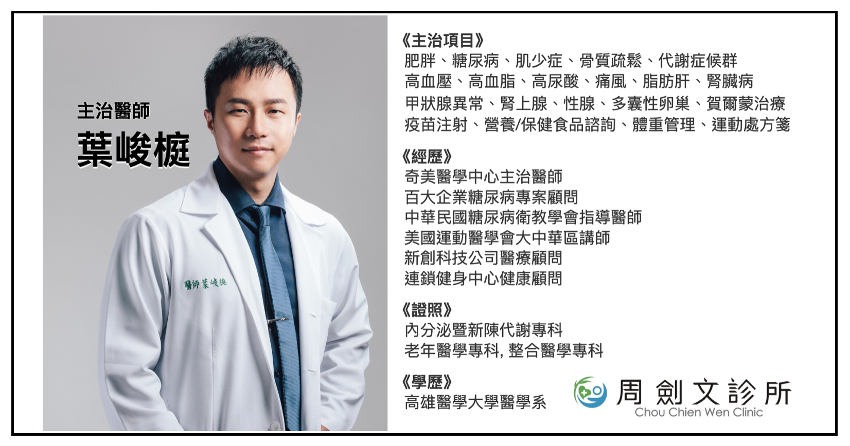 葉峻榳醫師專精肥胖、糖尿病、高血壓、高血脂等慢性疾病,擁有豐富的照護經驗和專業知識,他也身體力行,將重訓納入個人日常生活,整合醫學和運動概念,應用到病人身上。
