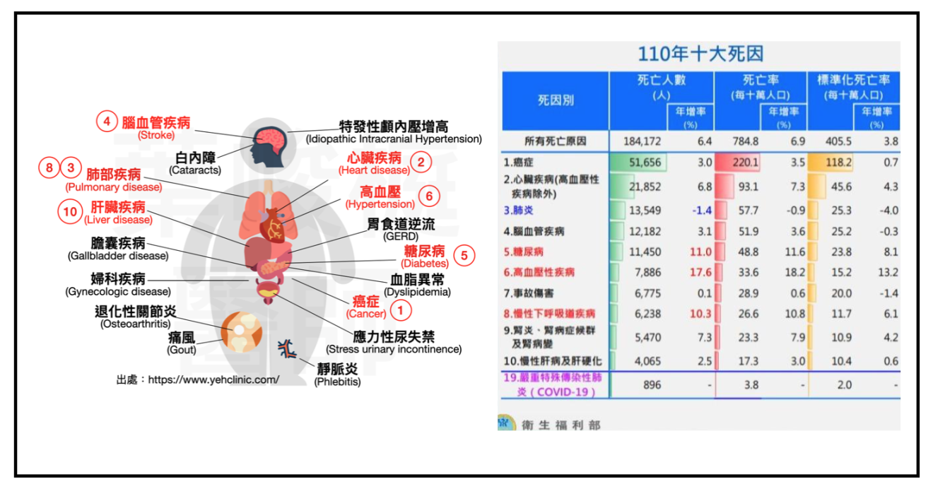 根據民國110年十大死因統計,可以發現跟肥胖相關疾病,依照排名分別是:癌症、心臟疾病、肺部疾病、腦血管疾病、糖尿病、高血壓、肝臟疾病。換句話說,若能解決肥胖問題,做好體重管理,就能進一步降低併發症。