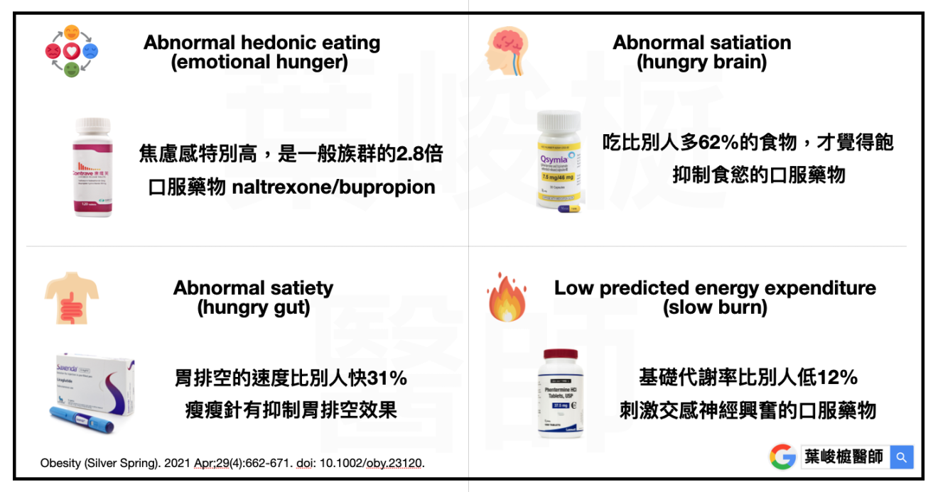 根據 2021 年 Mayo Clinic 研究,肥胖可以分成四種類型:飢餓大腦(飽足感差)、情緒飢餓(情緒影響飲食)、飢餓腸胃(飽腹感差)、慢速燃燒(基礎代謝率低)。