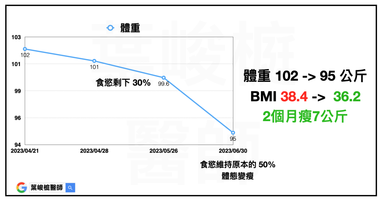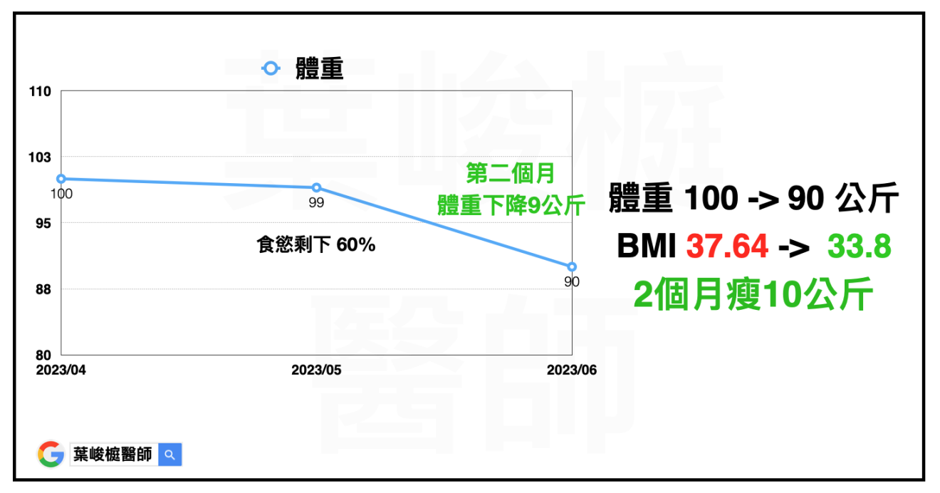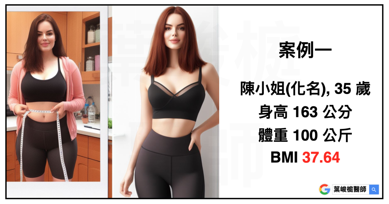 陳小姐(化名),上班族,35歲,身高163 公分,體重 100 公斤,BMI 37.64。其他慢性疾病包括:糖尿病前期、胰島素阻抗、脂肪肝、血脂異常、多囊性卵巢。經過醫療團隊評估,藉由飲食運動控制加上藥物治療,兩個月減重10公斤。