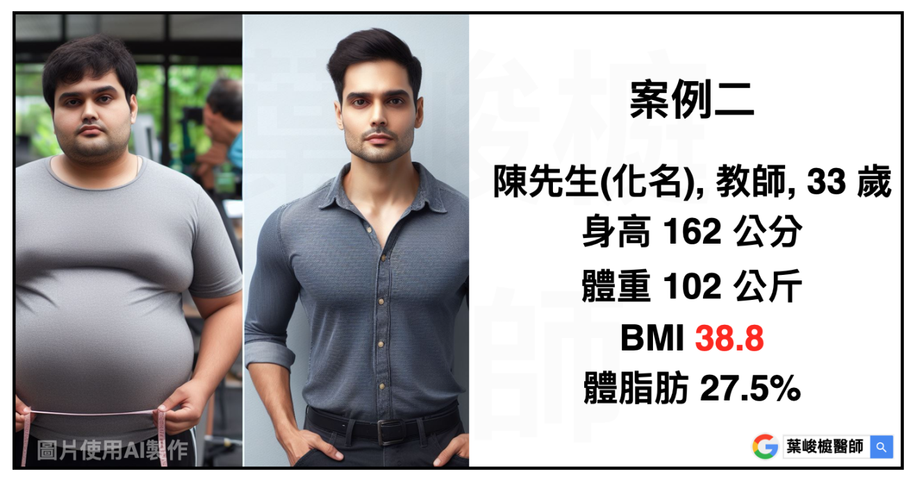 陳先生(化名),教師,33 歲,身高 162 公分,體重 102 公斤,BMI 38.8,體脂肪 27.5%。其他慢性疾病包括:糖尿病前期、胰島素阻抗、脂肪肝、血脂異常。經過醫療團隊評估,藉由飲食運動控制加上藥物治療,兩個月減重7公斤。