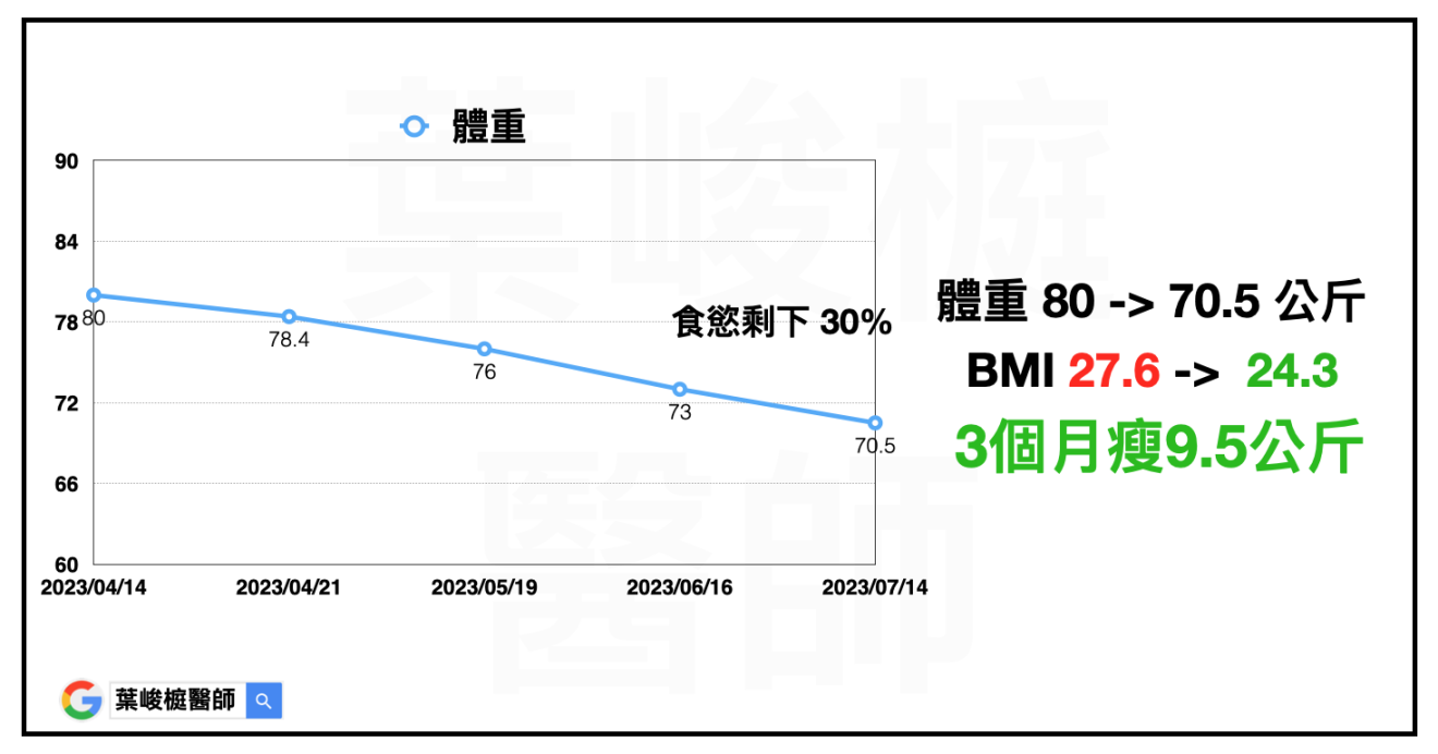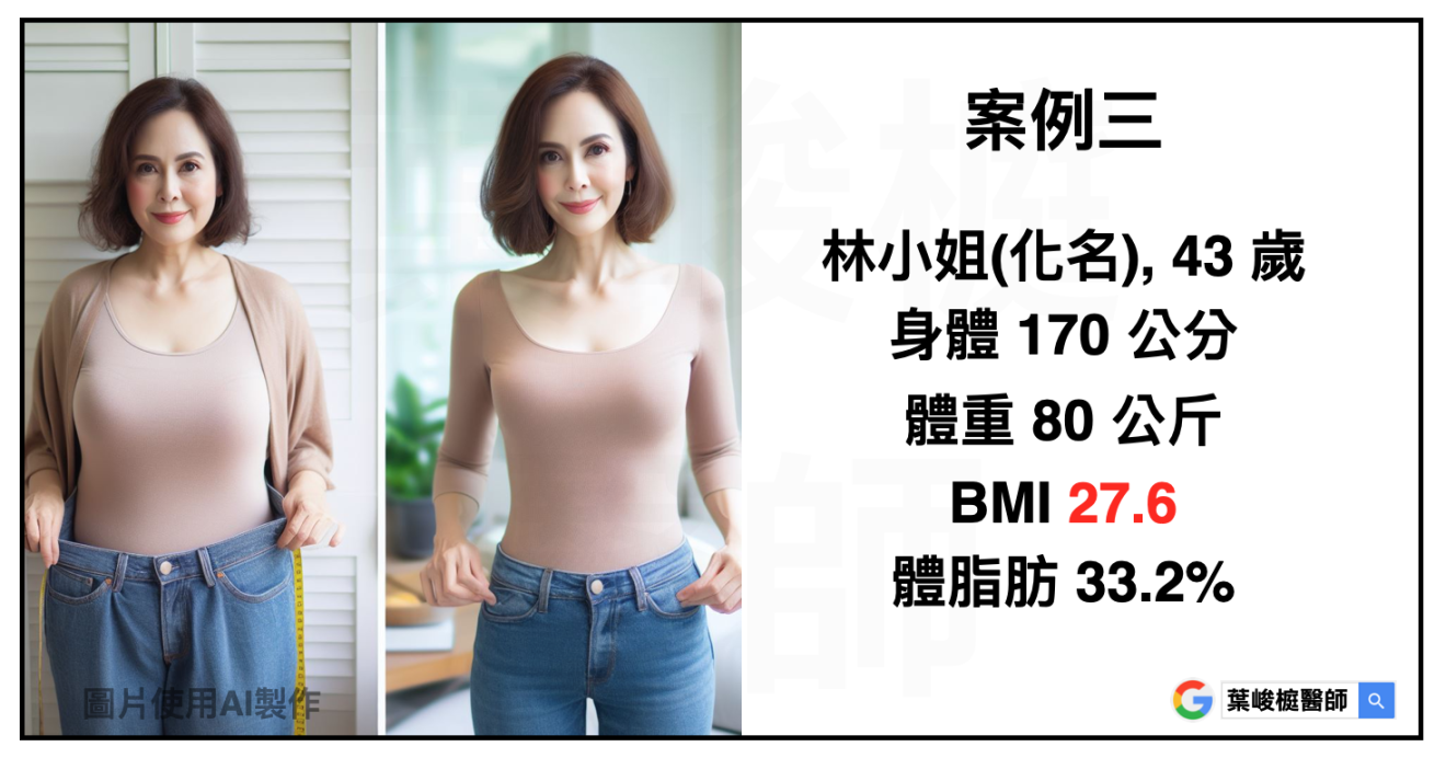 林小姐(化名),行政人員,需要輪夜班,43歲,身高170 公分,體重 80 公斤,BMI 27.6,體脂肪 33.2%。其他慢性疾病包括:胰島素阻抗、脂肪肝合併肝功能異常、血脂異常。經過醫療團隊評估,藉由飲食運動控制加上藥物治療,三個月瘦9.5公斤。