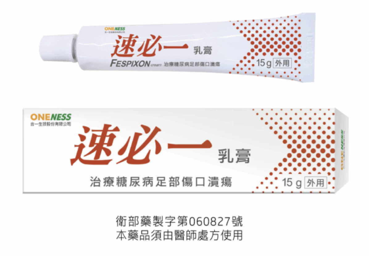 速必一乳膏 Fespixon®,由合一生技股份有限公司研發,可以抑制發炎,促進傷口癒合,專治糖尿病足部傷口潰瘍。