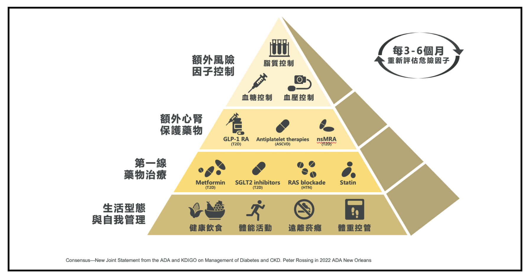 糖尿病腎病變,是糖尿病的嚴重併發症,藉由藥物治療四騎士「 RAS blockade、GLP-1 RA、SGLT2i、nsMRA」,它們各有獨特的機轉和好處,可以有效延緩腎衰竭、避免走向洗腎。