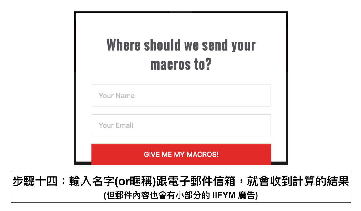 步驟十四:輸入名字(or暱稱)跟電子郵件信箱,就會收到計算的結果 (但郵件內容也會有小部分的 IIFYM 廣告,若不喜歡的可以就此打住,或收信看完後改移到垃圾郵件)。