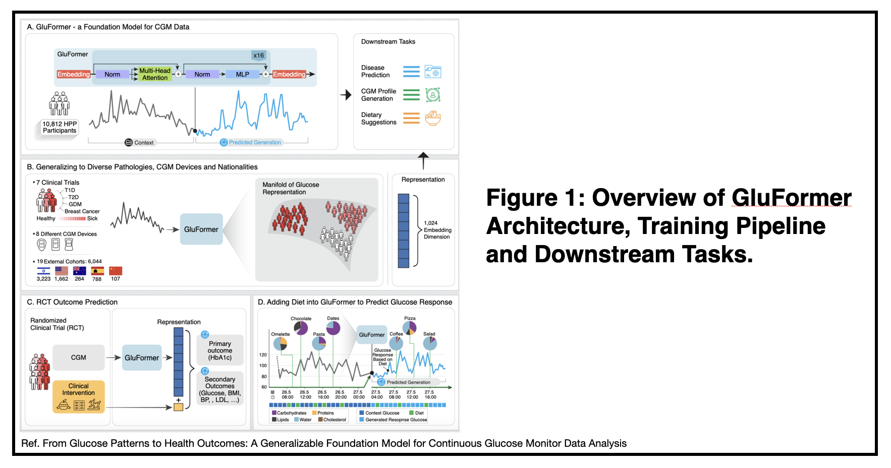GluFormer 是由 NVIDIA、魏茨曼科學研究所 (Weizmann Institute of Science),與 Pheno.AI 公司合作開發的 AI 基礎模型 (generative foundation model)。它是透過自監督學習 (self-supervised learning, SSL) 的方式,從大量且未標記的連續血糖監測數據庫中,自主學習血糖模式,並產生能夠反映個體健康狀況的「血糖表徵」 (representations) 或稱作嵌入 (embeddings)。