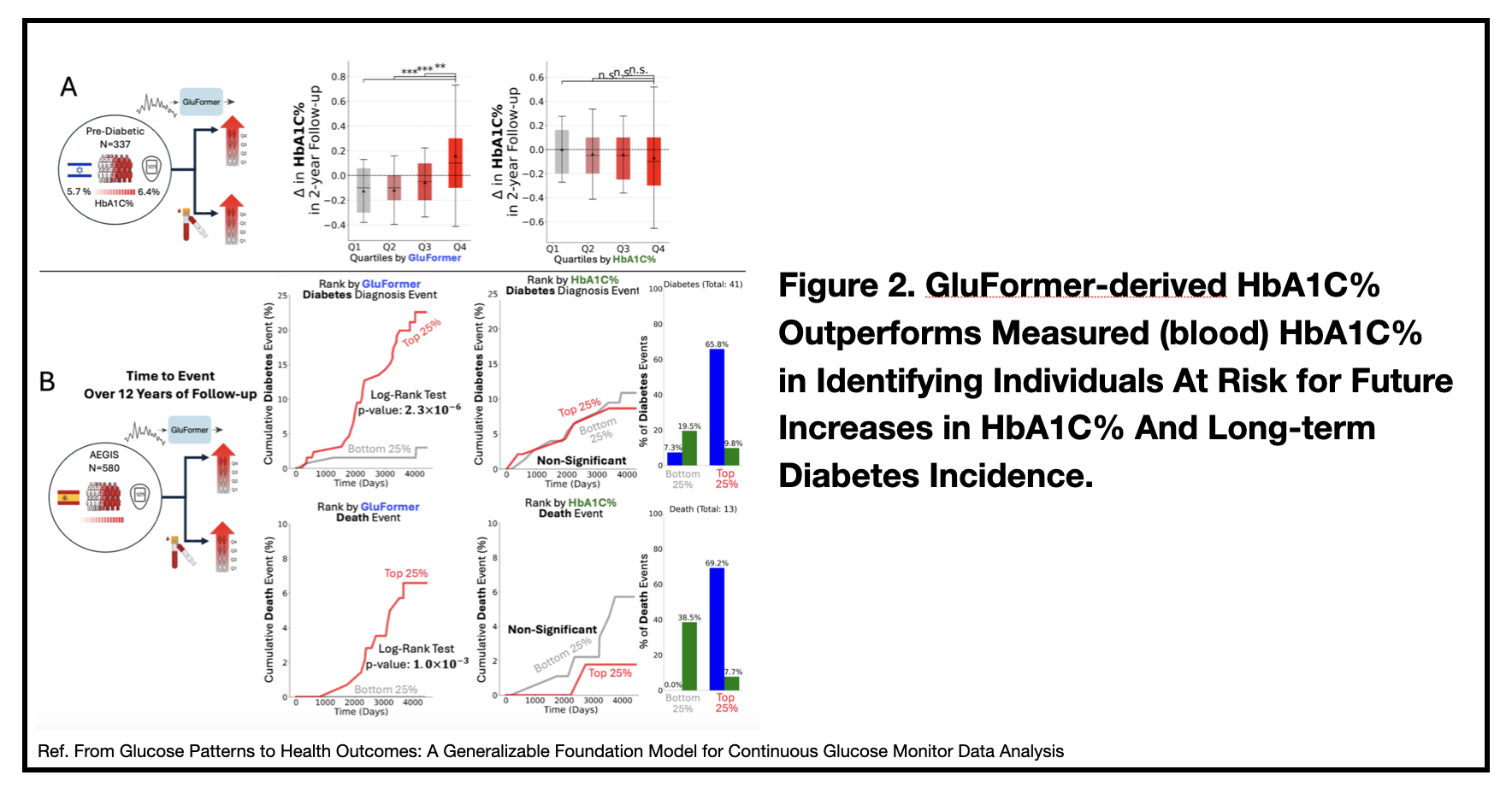 研究發現,GluFormer 模型輸出的「血糖表徵」 (representations),在預測糖化血色素 (HbA1c) 方面,甚至優於連續血糖監測儀的 「葡萄糖管理指標」(Glucose Management Indicator, GMI)。