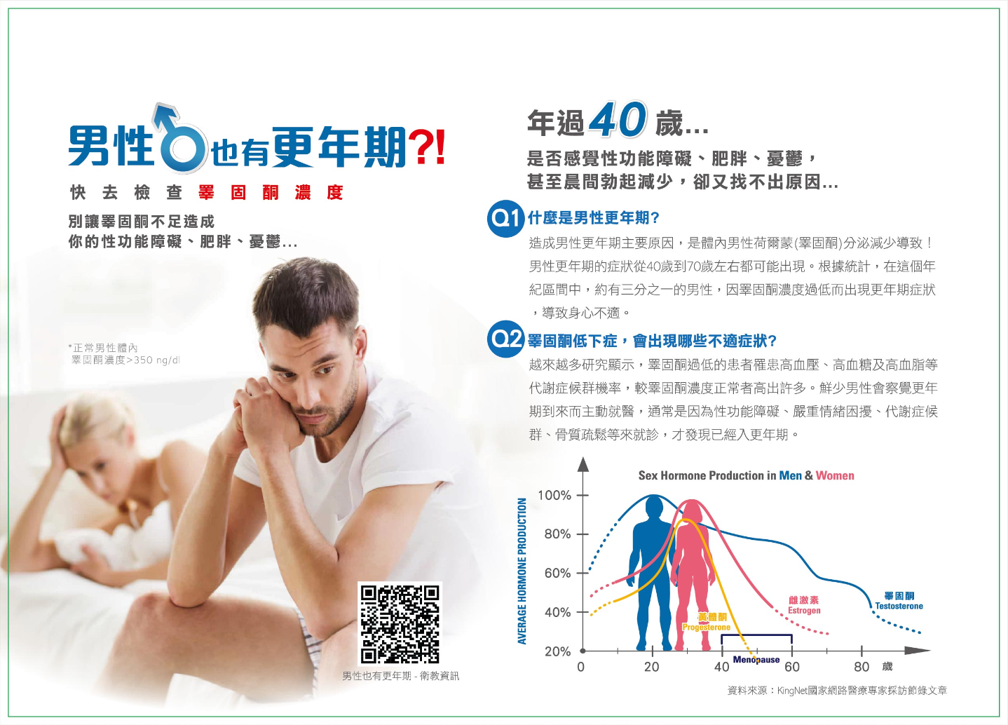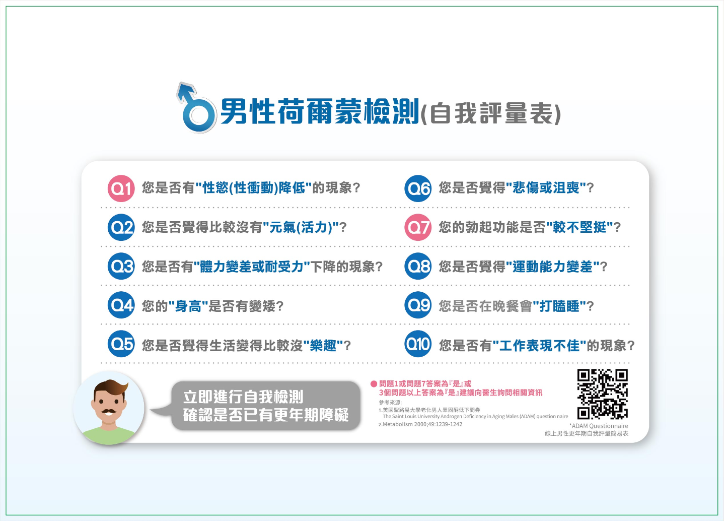 ⬧認識男性更年期症狀: 睪固酮低下可能導致性慾降低、勃起困難、疲倦、肌肉流失、腹部肥胖、情緒不穩及專注力下降等。若出現多項警訊,應有所警覺。