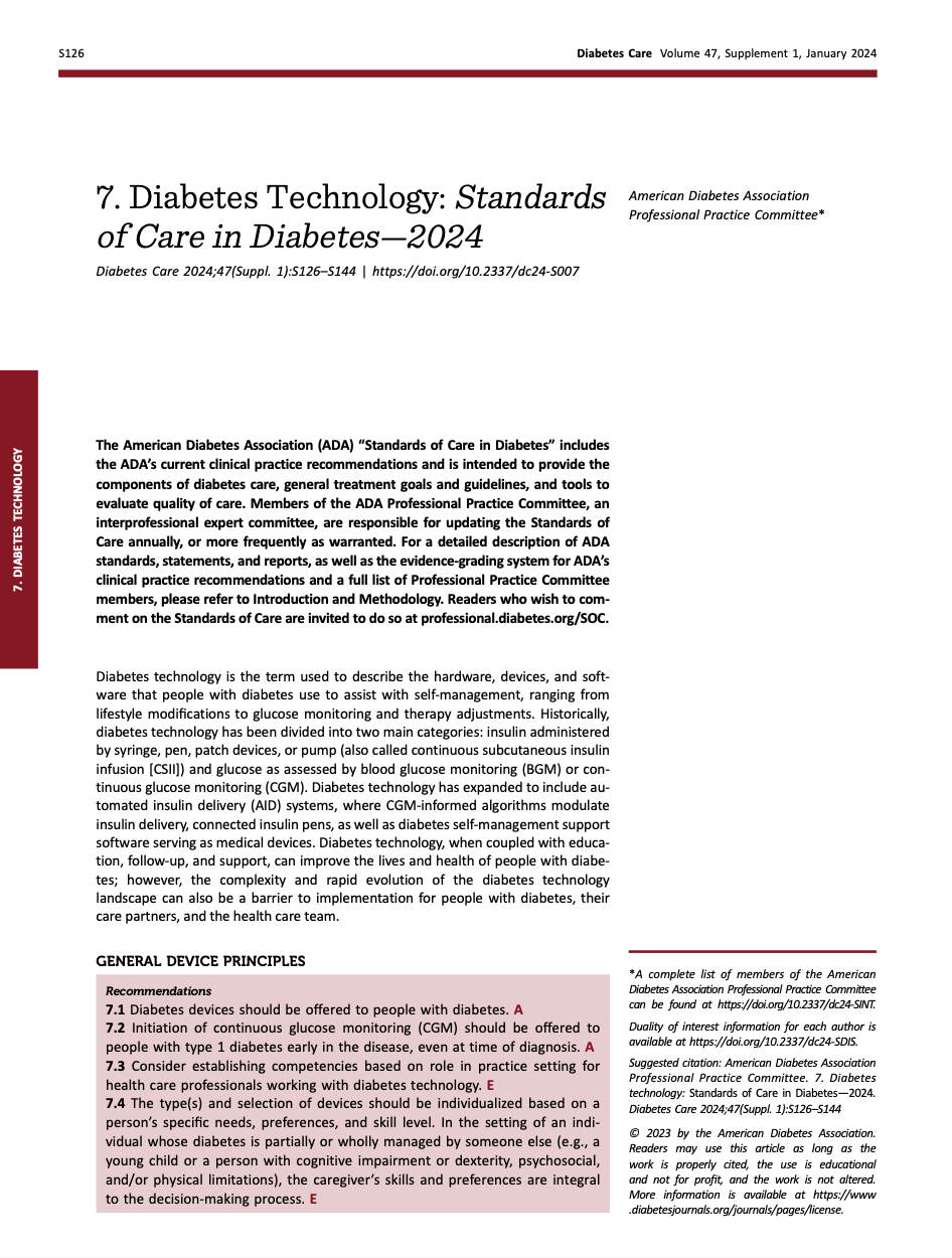 以糖尿病照護為核心的新科技逐漸普及,並列入糖尿病指引。以下整理出2024年美國糖尿病醫學會指引,證據等級位於A跟B的建議 (ADA evidence-grading system for “Standards of Care in Diabetes”)。