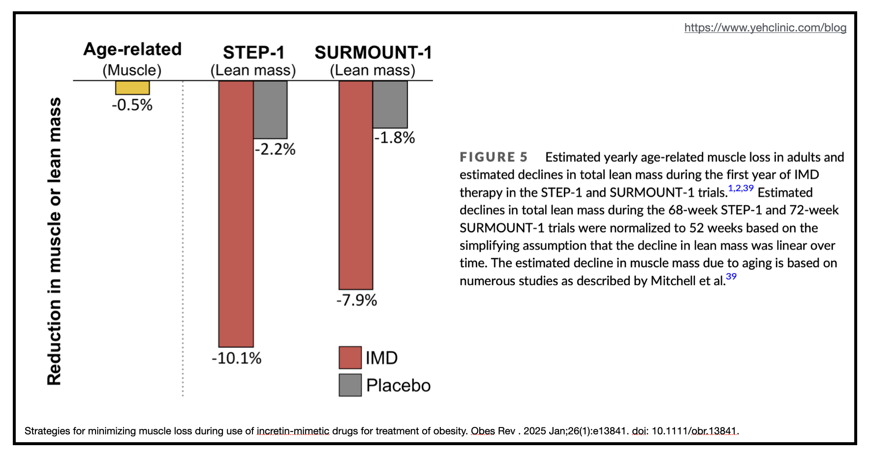 2025年一月發表的研究論文「Strategies for minimizing muscle loss during use of incretin-mimetic drugs for treatment of obesity. Obes Rev . 2025 Jan;26(1):e13841. doi: 10.1111/obr.13841. Epub 2024 Sep 19.」,分析了兩篇 IMDs 使用在肥胖患者的臨床試驗,提醒大家追求減肥之餘,別忘了關注肌肉流失問題。