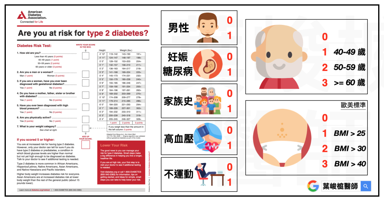 根據2024年美國糖尿病學會指引,「年齡、身高體重(Body Mass Index, BMI)、性別、妊娠期糖尿病、家族史、高血壓、不運動」這七個因素,可用來評估糖尿病罹病風險。