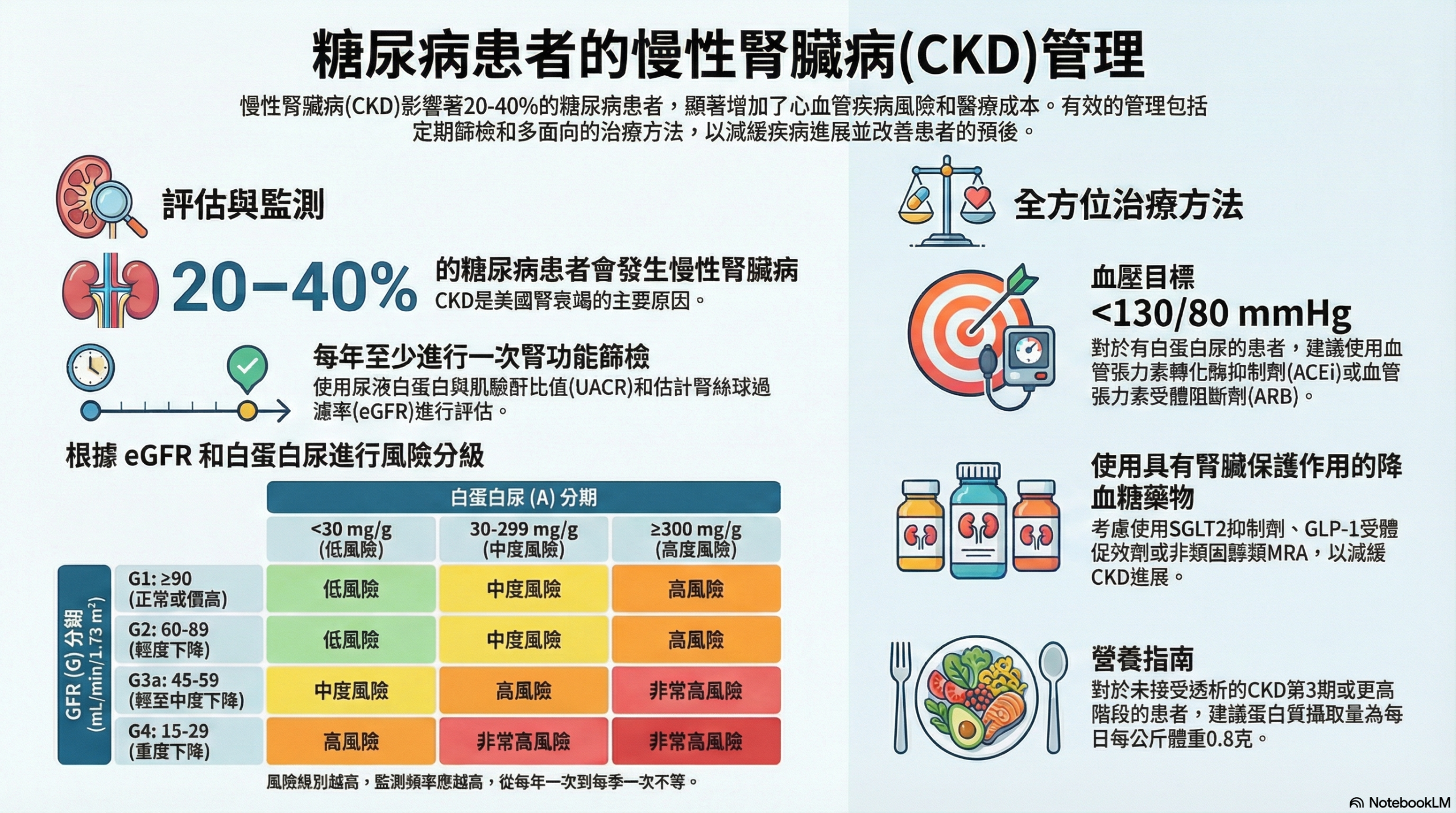1. 初級預防核心: 唯一證實能有效預防 CKD 發展的初級介入措施,是將血糖控制在目標內(A1C 目標 7%),以及嚴格的血壓管理(目標 <130/80 mmHg)。