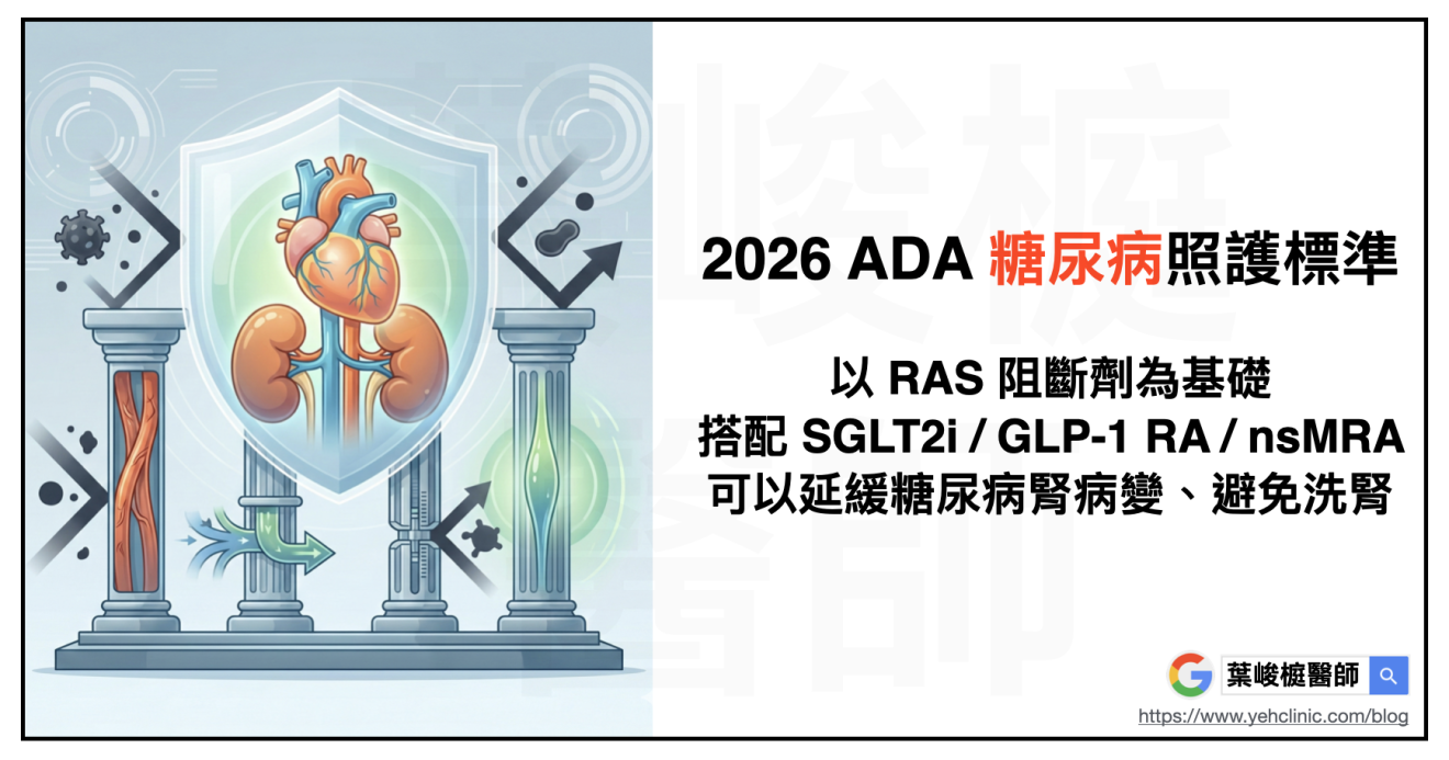 2026 年美國糖尿病學會的標準,為糖尿病腎病變治療制定了核心策略,以 RAS 阻斷劑為基礎,依序搭配 SGLT2i / GLP-1 RA / nsMRA 的組合治療,將管理目標從單純的血糖和血壓控制,擴展到最大化利用具有心腎保護實證的新型藥物。
