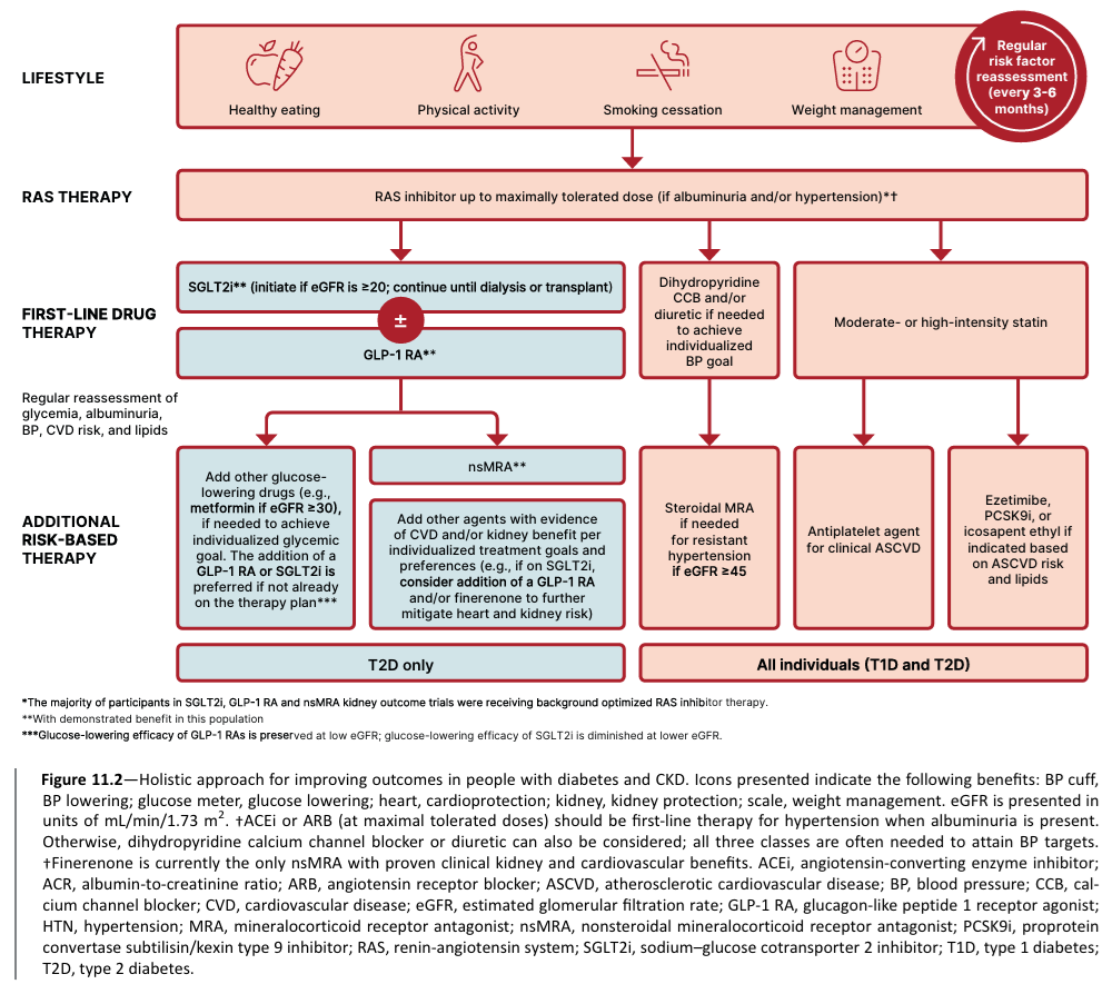 ADA 亦支持在最大耐受劑量 RAS 阻斷劑的基礎上,考慮同時啟動 SGLT2 抑制劑和 nsMRA(Finerenone)的組合療法,尤其針對 UACR ≥100 mg/g 的患者,來最大化地改善白蛋白尿。所有糖尿病患者每年至少應評估 UACR 和 eGFR 一次,以實現早期診斷和治療。