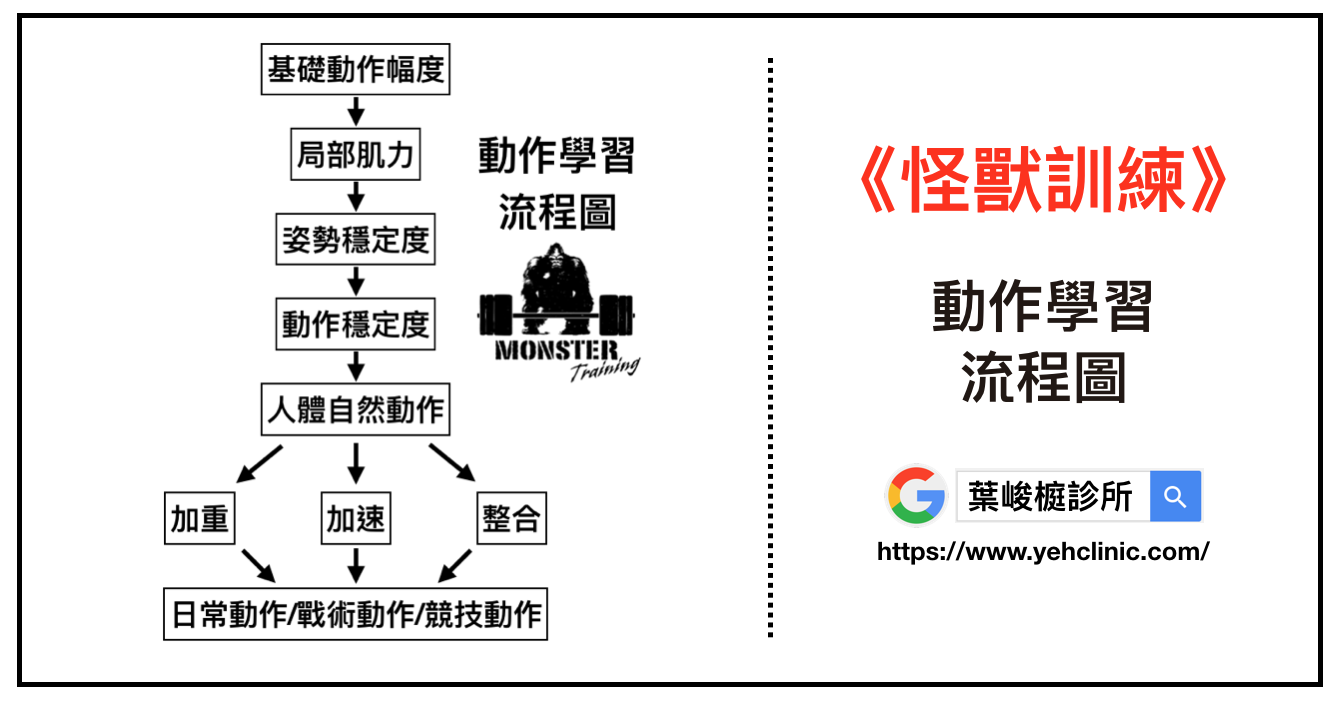 該如何拿回身體的控制能力?根據怪獸訓練「動作學習流程圖」:基礎動作幅度、局部肌力、姿勢穩定度跟動作穩定度等四項基礎要先處理好,接著在人體自然動作之下,進行加重、加速跟整合,然後才進入到日常動作/戰術動作/競技動作。