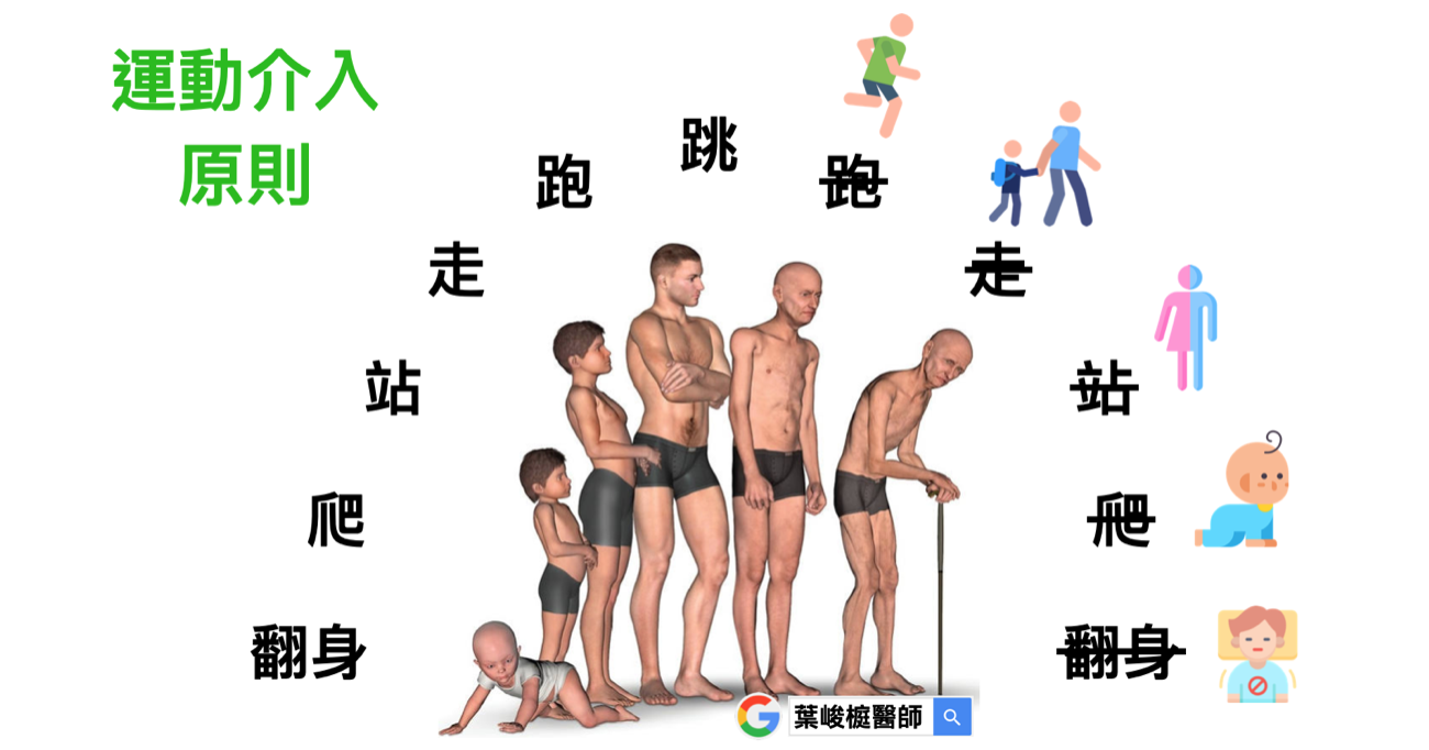 我們照顧嬰兒,會觀察他(她)的發育情況,給予相對應的活動訓練,譬如:練習翻身、訓練站立、輔助行走。同樣地,對於衰弱的族群,我們也要分類評估,給予最適合的運動建議。