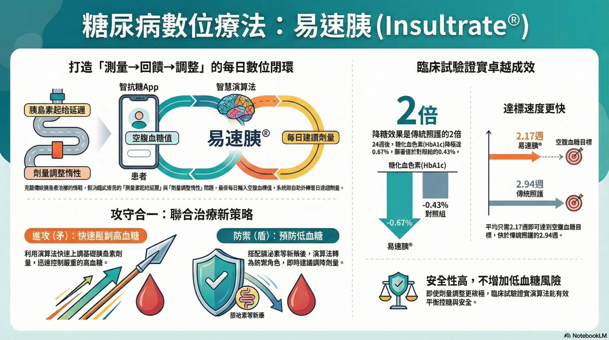 易速胰 (Insultrate®) 作為糖尿病數位療法,在台灣臨床試驗中,證實了其在降低 HbA1c 與提升空腹血糖達標率的有效性。