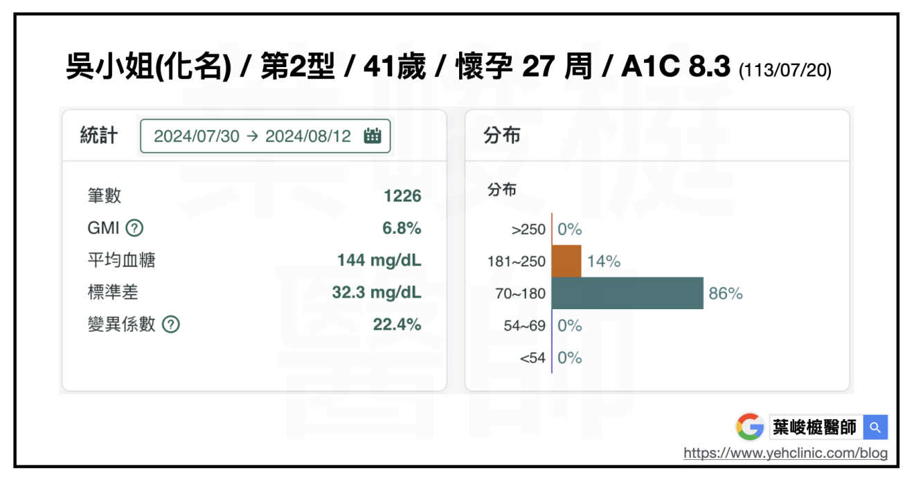 ◆ 吳小姐(化名) / 41歲 / 懷孕 27 週 / 第2型糖尿病,糖化血色素 8.3% (2024.07.20)。