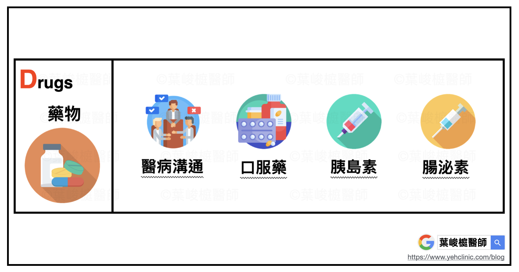 Biguanides(二甲雙胍) : 首選藥物,具有降低血糖、和減少心血管事件的好處。 當 Biguanides 無法有效控制血糖或有其他考量時,會考慮加入第二線藥物。