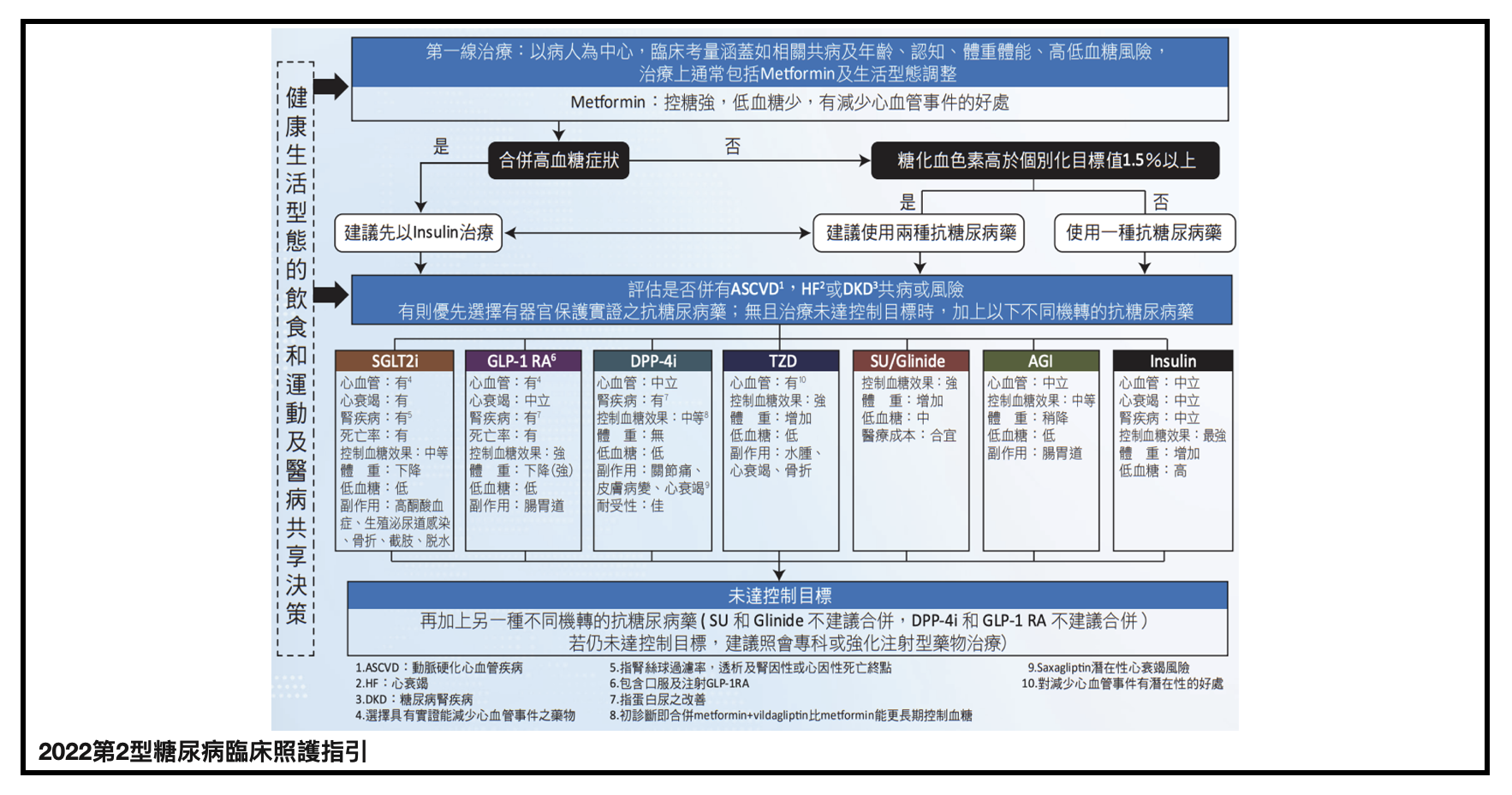 根據患者是否合併動脈粥狀硬化性心血管疾病 (Atherosclerotic Cardiovascular Disease, ASCVD) 或心臟衰竭 (Heart failure, HF) / 慢性腎臟病 (Chronic kidney disease, CKD),以及是否需要避免低血糖或體重增加,將藥物分為兩大類: