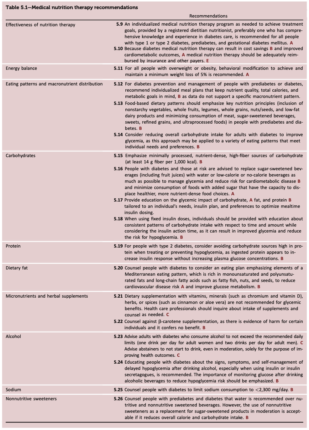 ⬧5.9 為了達到治療目標,由合格營養師 (最好是具備糖尿病照護知識和經驗的營養師),來制定個人營養治療計劃。建議所有「第1型糖尿病」、「第2型糖尿病」、「糖尿病前期」和「妊娠糖尿病」的人,都要接受營養治療計劃。A