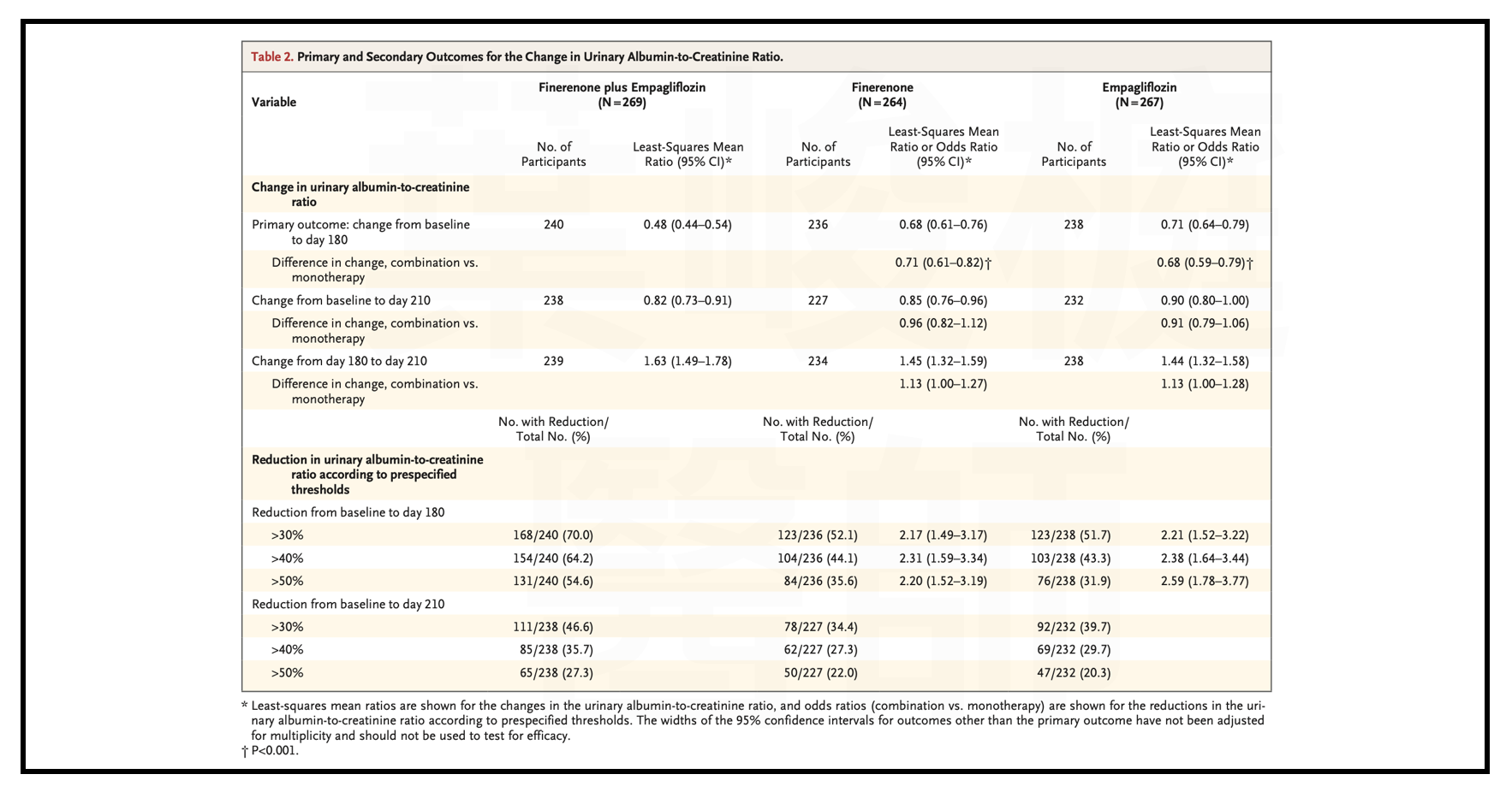 - 試驗設計:CONFIDENCE 試驗是一項雙盲、隨機、對照研究。受試者為已穩定服用 RASi 的糖尿病腎病變患者,被隨機分為 Finerenone 組、Empagliflozin 組、或聯合治療組。主要終點是180天尿液白蛋白肌酐比值 (UACR) 的相對變化。