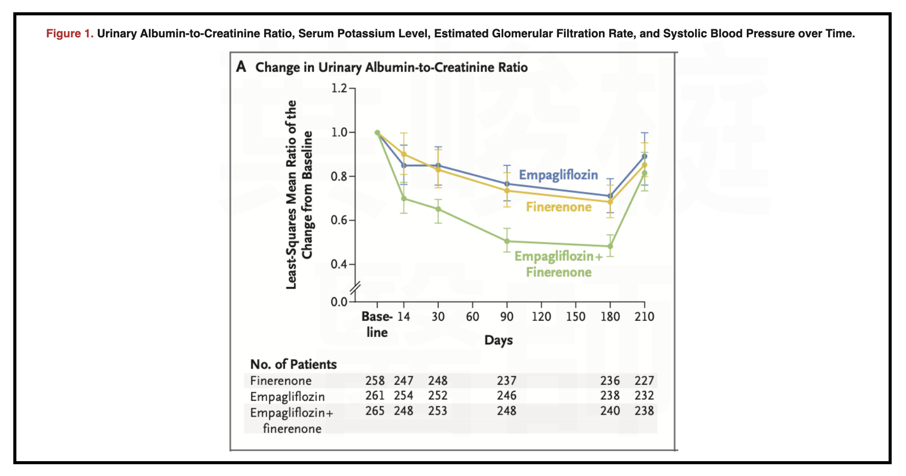 本試驗的主要療效終點是從基線到第180天,尿液白蛋白肌酐比值(UACR)的相對變化。UACR 的變化是評估腎臟疾病進展的重要指標,UACR 降低程度跟腎臟及心血管事件的風險下降密切相關。