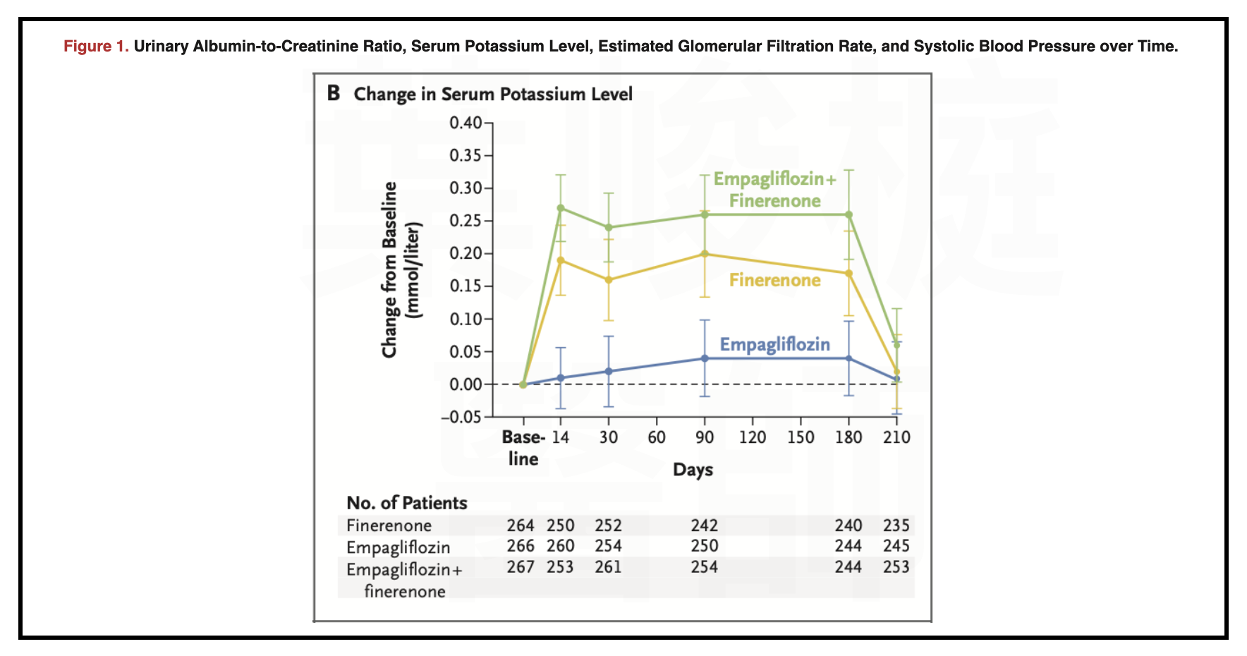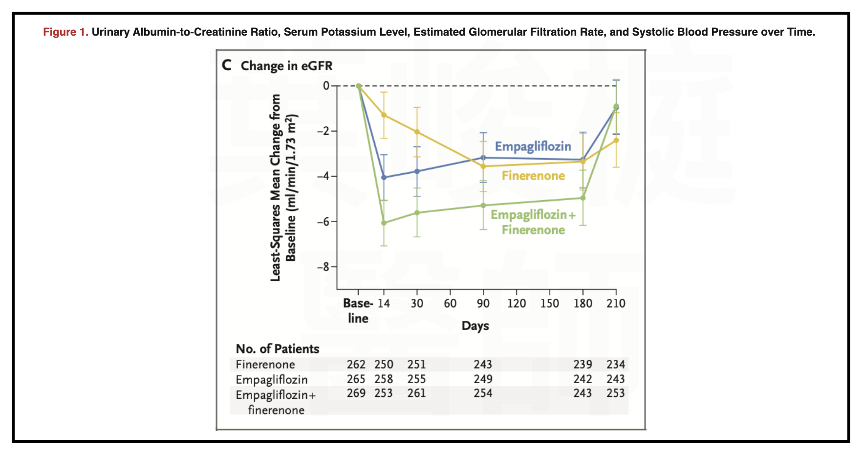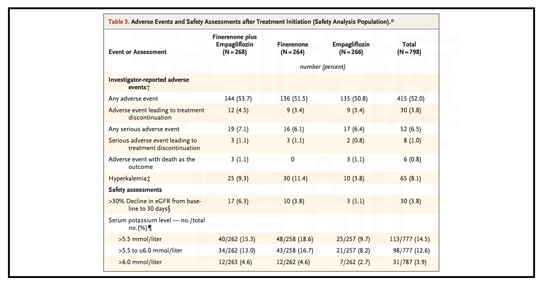 - eGFR變化: 聯合治療組初期 eGFR 下降超過30%的比例(6.3%)高於單獨治療組(Finerenone 組3.8%,Empagliflozin 組1.1%)。然而,這種 eGFR 的初期下降,在停藥後是可逆的,且急性腎損傷的發生率在聯合治療組中並不常見(僅1.9%)。