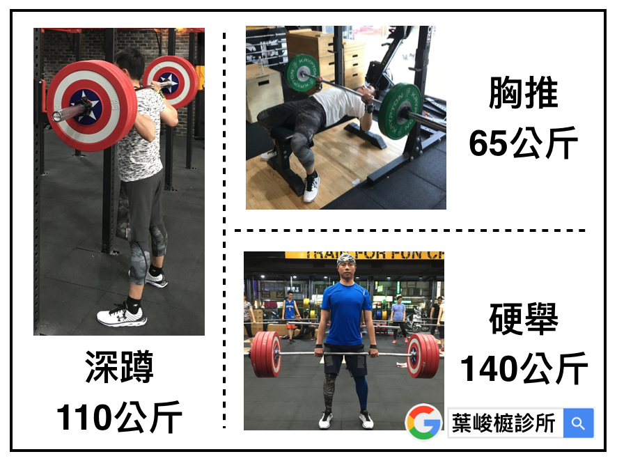 於是,在大翰的訓練下,我開始一天吃五餐,一週練 3~5 天,大概只花了半年左右,我的體重,從 63 公斤爬到 73 公斤,健力三項個人紀錄為:深蹲110公斤、硬舉 140 公斤、胸推 65 公斤。