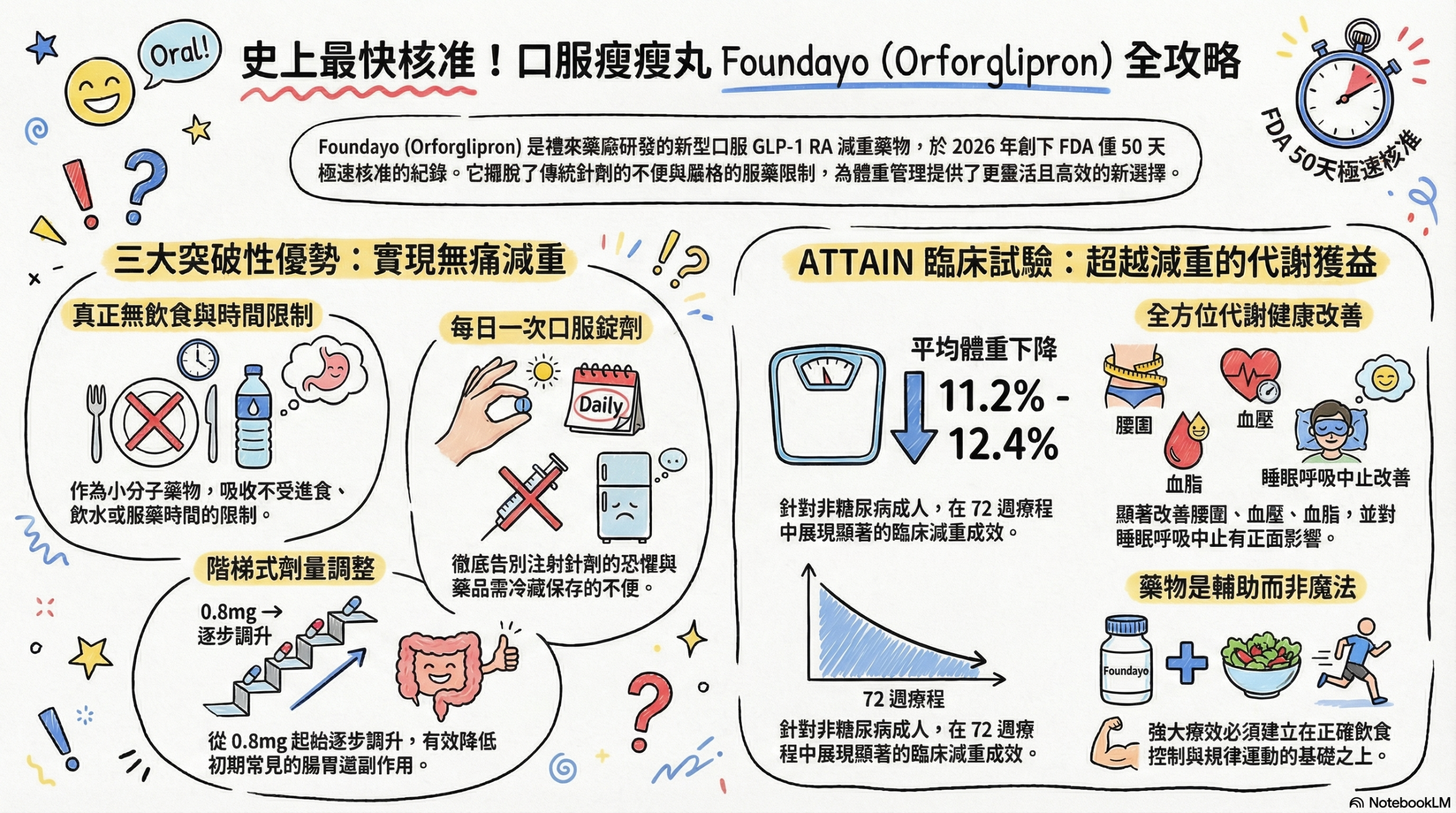 Foundayo (Orforglipron) 的問世,標誌著肥胖治療正式邁入「高便利性口服時代」。它不僅為減重門診增添了具備扎實數據支持的新武器,更為許多害怕打針、或難以配合嚴格空腹規定的患者,提供了一個靈活且高效的新選擇。