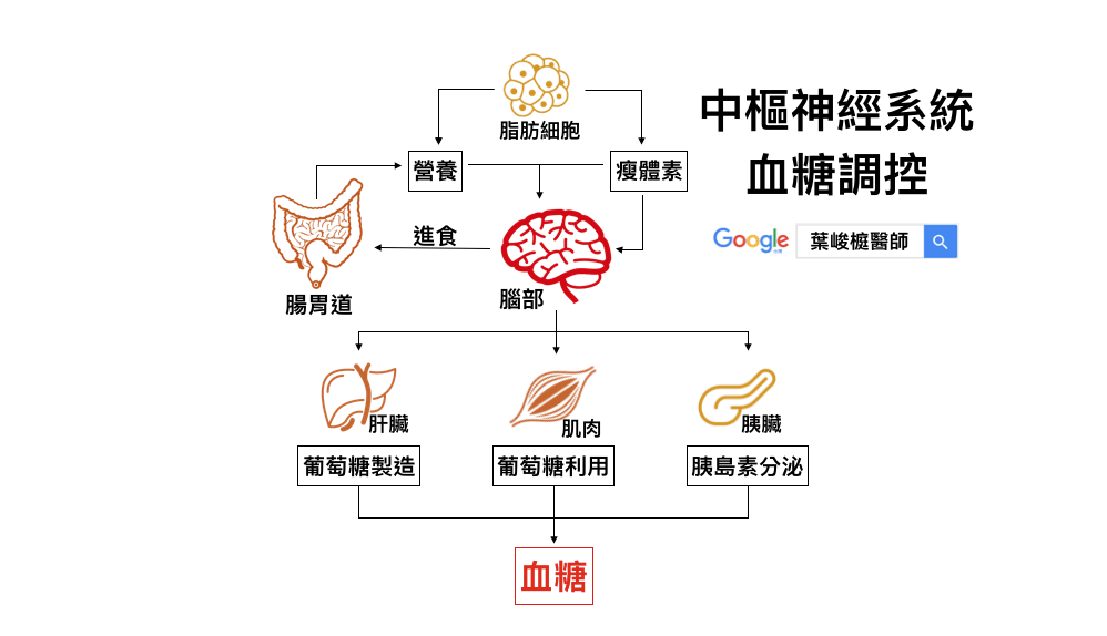 血糖會受到很多因素所影響。根據糖尿病大師 Defronzo 的研究,造成高血糖的病理生理機轉,主要有八大因素,其中一項就是中樞神經(傳導物質)失能。因此,調控食慾的相關神經元若出現問題,連帶的血糖也會波動,甚至導致肥胖。
