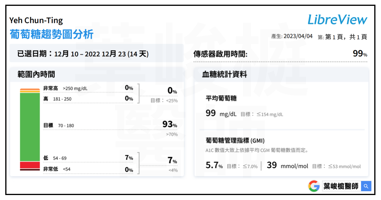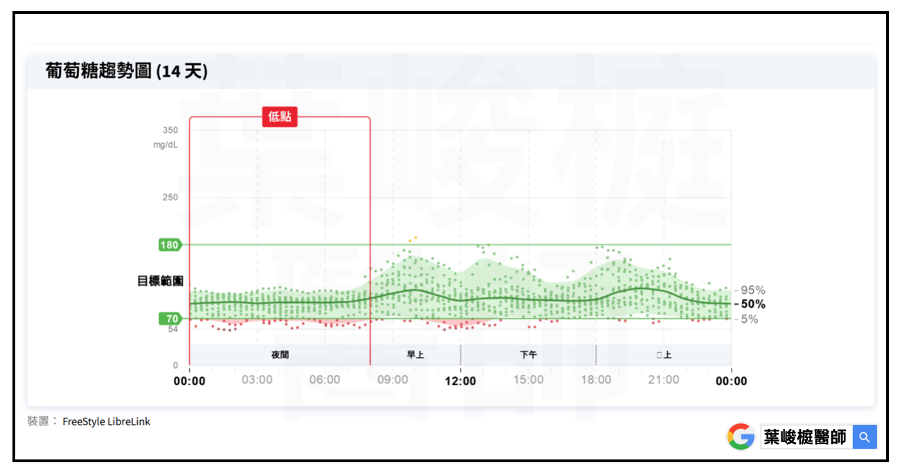首先,葉醫師本人的血糖數據,有93%都落在目標範圍內 70-180 mg/dL,有7%落在54-69 mg/dL,排除裝機前一兩天的異常數據,整體而言算正常。但是,我們可以看到14天血糖數據推算出來的葡萄糖管理指標(GMI),顯示為5.7%(目標≤7.0%)。