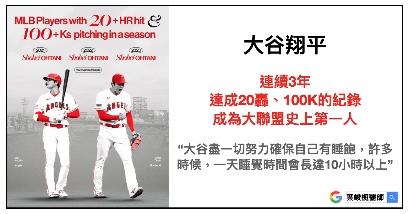 舉例來說,美國大聯盟球星大谷翔平,以投打二刀流征服全世界球迷,為了要維持頂尖表現,大谷盡一切努力確保自己有睡飽,許多時候,一天睡覺時間會長達10小時以上,平均而言,一天睡足八個半到九個小時是家常便飯。