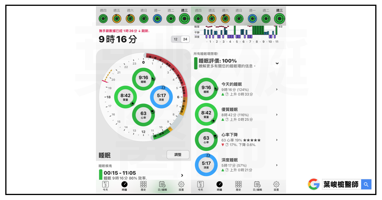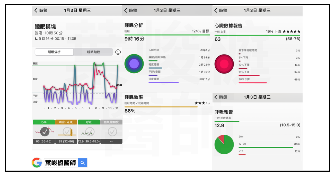 譬如說,在2024年01月03日(週三),我的睡眠總時數達到9小時16分鐘,優質睡眠為8小時42分鐘,深度睡眠為5小時17分鐘,睡眠效率為86%。睡眠數據往前推一個月,雖然每天的睡眠品質不一,有的時候好、有的時候略差,但整體睡眠銀行(資產)是超額增長,足以應付不時之需。