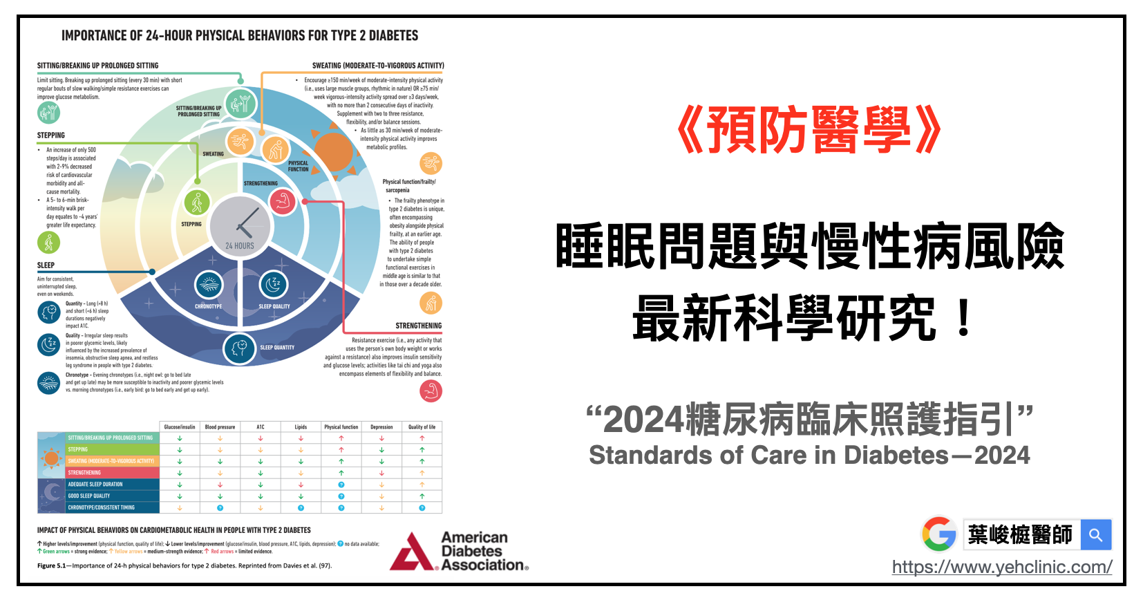 根據美國糖尿病醫學會最新指引,睡眠障礙是罹患糖尿病和妊娠糖尿病的危險因子。因此,充足時間(Quantity)、高品質(Quality)、日夜規律早睡早起(Chronotype)的睡眠,對於血糖、血壓、血脂、生活品質,都有明顯好處。最新指引強調要對生活型態進行全面評估,包括睡眠時間長短、日夜輪班工作和休息日等細節,以降低慢性病風險。