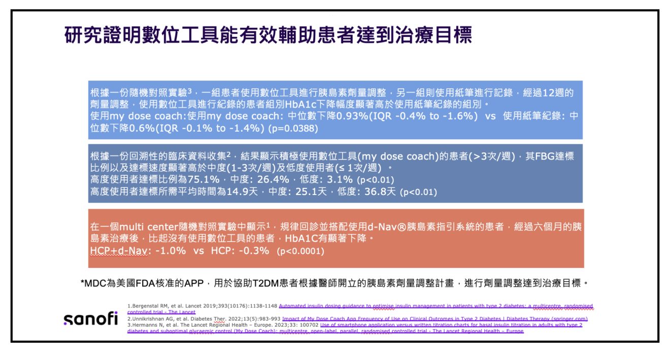 根據數位療法相關研究指出,相較於紙筆紀錄模式,藉由數位工具如 d-Nav®、My Dose Coach™ 輔助,可以協助血糖儘速達標,糖化血色素的進步也比較好。