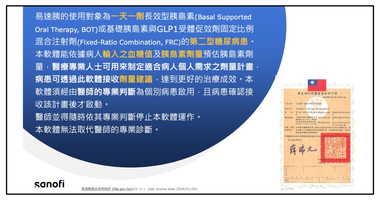 • 本軟體只限用於一天一劑長效型胰島素(Basal Supported Oral Therapy, BOT)或基礎胰島素與GLP1受體促效劑固定比例混合注射劑(Fixed-Ratio Combination, FRC)的第二型糖尿病患。