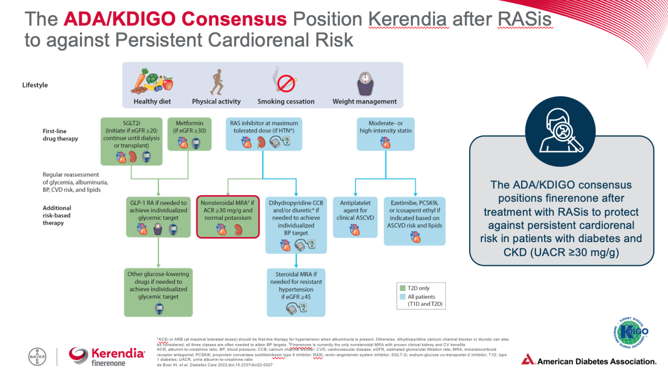 根據 ADA/KDIGO 權威指引建議,針對有糖尿病合併慢性腎臟病,第一步要做好健康飲食、運動、戒菸、體重管理,然後使用 ACEi/ARB 來降血壓、保護腎臟。接著,我們可以使用非類固醇礦物質皮質素受體拮抗劑如 Finerenone,來降低心血管疾病、慢性腎臟病風險。