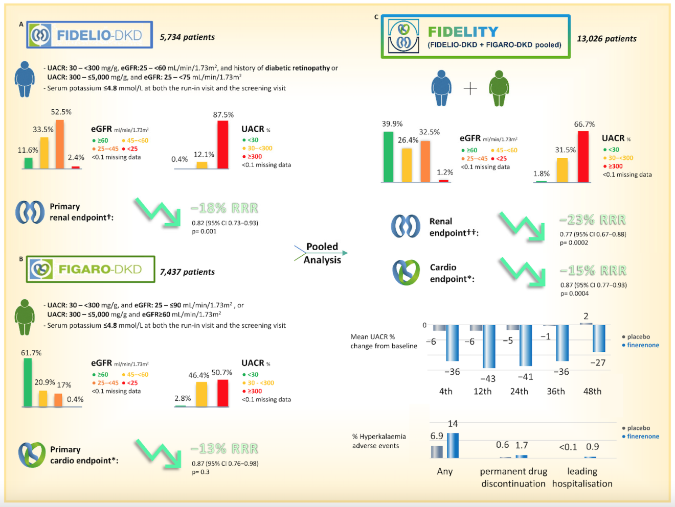 Figure 4. Finerenone phase III trials and pooled analysis at glance. (A): Finerenone in Reducing Kidney Failure and Disease Progression in Diabetic Kidney Disease (FIDELIO-DKD); (B): Finerenone in Reducing Cardiovascular Mortality and Morbidity in Diabetic Kidney Disease (FIGARO-DKD); (C): Combined FIDELIO-DKD and FIGARO-DKD Trial program analysis (FIDELITY). † Composite renal outcome: kidney failure (ebd-stage kidney disease or sustained decrease in eGFR to <15 mL/min/1.73 m2), sustained ≥40% decrease in eGFR from baseline, or renal death. * Composite cardio outcome: death from cardiovascular causes, non-fatal myocardial infarction, non-fatal stroke, hospitalization for heart failure. †† Composite renal outcome: kidney failure (ebd-stage kidney disease or sustained decrease in eGFR to <15 mL/min/1.73 m2), sustained ≥57% decrease in eGFR from baseline, or renal death. (From J. Clin. Med. 2023, 12(12), 3992; https://doi.org/10.3390/jcm12123992)