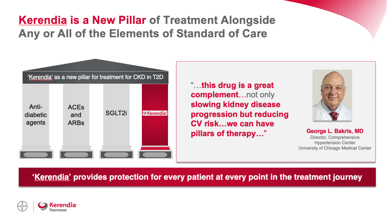 芝加哥大學醫學院教授 George L. Bakris,專門研究高血壓、腎臟病、糖尿病腎病變的專家,提到 Finerenone (Kerendia®) 可以延緩腎臟病惡化、降低心血管風險,對於所有糖尿病腎病變的病人來說,絕對是一大福音。