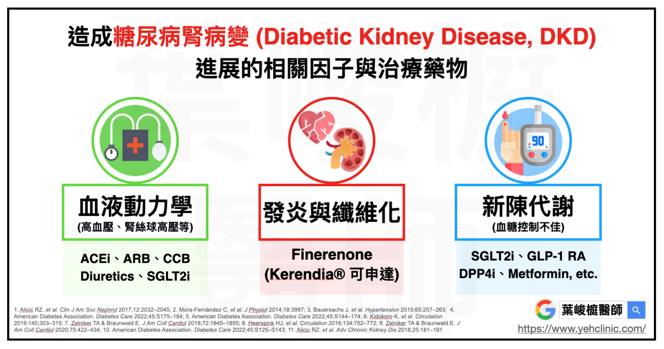 糖尿病是造成腎病變的重要原因之一。糖尿病腎病變 (Diabetic Kidney Disease, DKD) 是因為高血糖導致血液動力學異常、新陳代謝失衡、發炎與纖維化。以往治療糖尿病腎病變藥物,多著重在血液動力學和新陳代謝兩方面,對於改善發炎與纖維化束手無策。現在我們多了新武器,可以改善發炎與纖維化,保護腎臟。