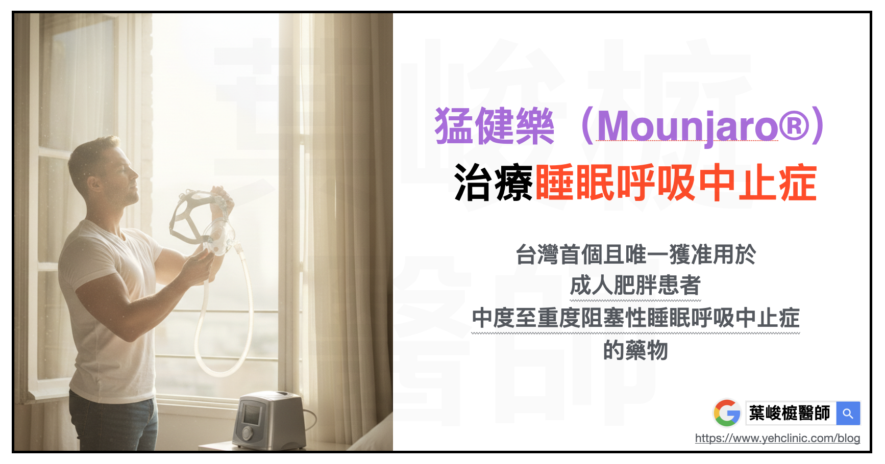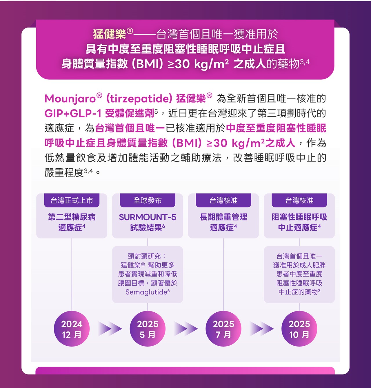 2025年10月,台灣衛福部正式核准禮來藥廠(Eli Lilly)的猛健樂® (Mounjaro,Tirzepatide) 新增適應症,用於治療「中度至重度阻塞性睡眠呼吸中止症且身體質量指數(BMI)≥ 30 kg/m2 之成人」,作為低熱量飲食及增加體能活動之輔助療法。
