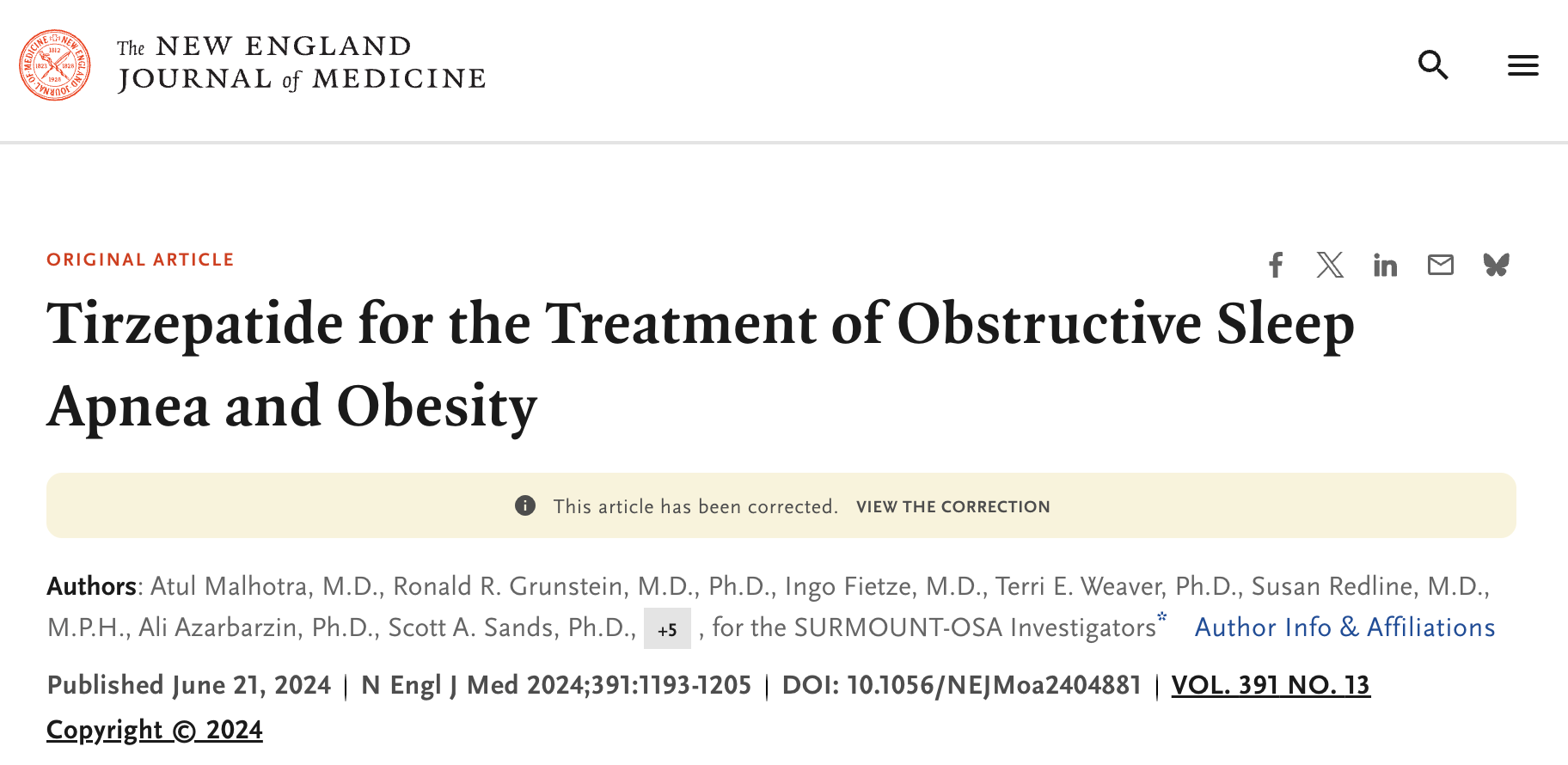 根據 SURMOUNT-OSA 第三期臨床試驗結果(Tirzepatide for the Treatment of Obstructive Sleep Apnea and Obesity. June 21, 2024 N Engl J Med 2024;391:1193-1205 DOI: 10.1056/NEJMoa2404881),猛健樂(Mounjaro®,Tirzepatide)展現了驚人療效,不僅能顯著降低睡眠呼吸中止次數,還具備卓越減重效果。