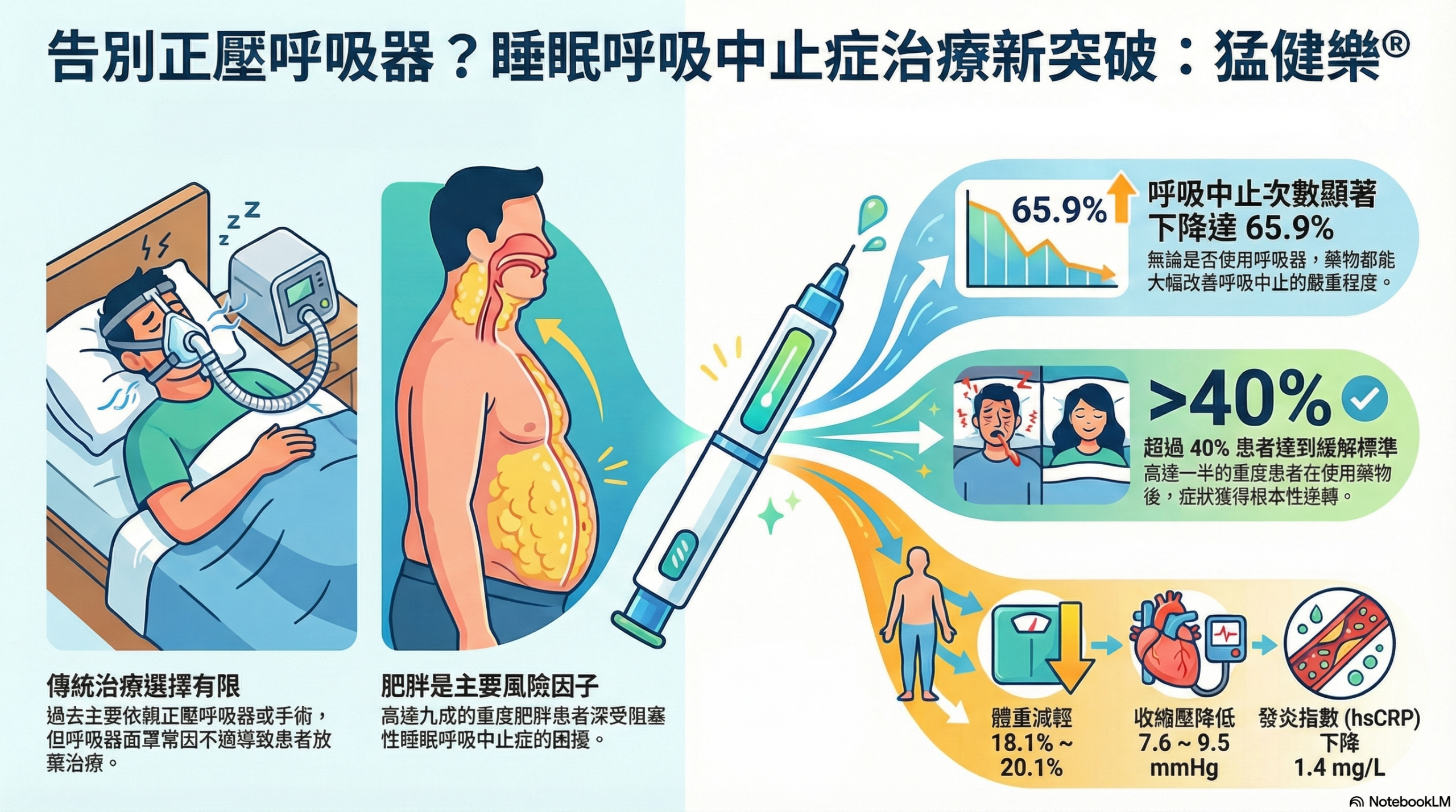 根據 SURMOUNT-OSA 第三期臨床試驗結果(Tirzepatide for the Treatment of Obstructive Sleep Apnea and Obesity. June 21, 2024 N Engl J Med 2024;391:1193-1205 DOI: 10.1056/NEJMoa2404881),猛健樂(Mounjaro®,Tirzepatide)展現了驚人療效,不僅能顯著降低睡眠呼吸中止次數,還具備卓越減重效果。