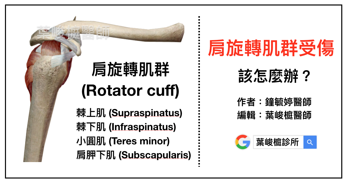 肩旋轉肌群 (Rotator cuff),由四塊肌肉所組成,包括棘上肌 (Supraspinatus)、棘下肌 (Infraspinatus)、小圓肌 (Teres minor),以及肩胛下肌 (Subscapularis)。這四個肌肉,除了協助肩膀做出三個平面的活動,也具有維持肩膀動態穩定的功能。