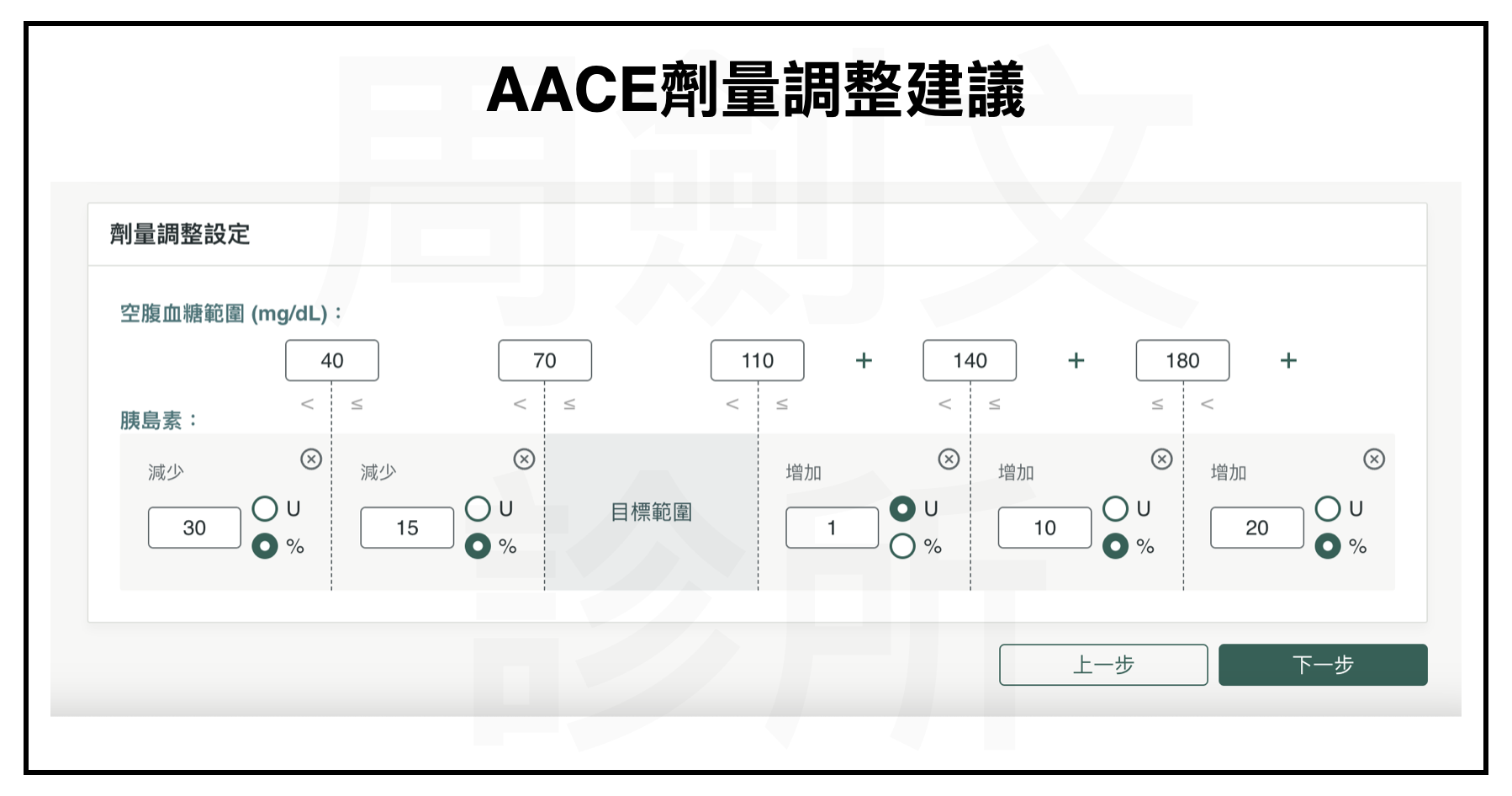 Insultrate®易速胰可以根據醫師設定的公式,參考每日輸入的空腹血糖和注射劑量,精準提醒糖尿病友注射劑量。那麼,該如何訂定公式呢?我們可以使用內建的 AACE 模板,或是設定醫師專屬公式。