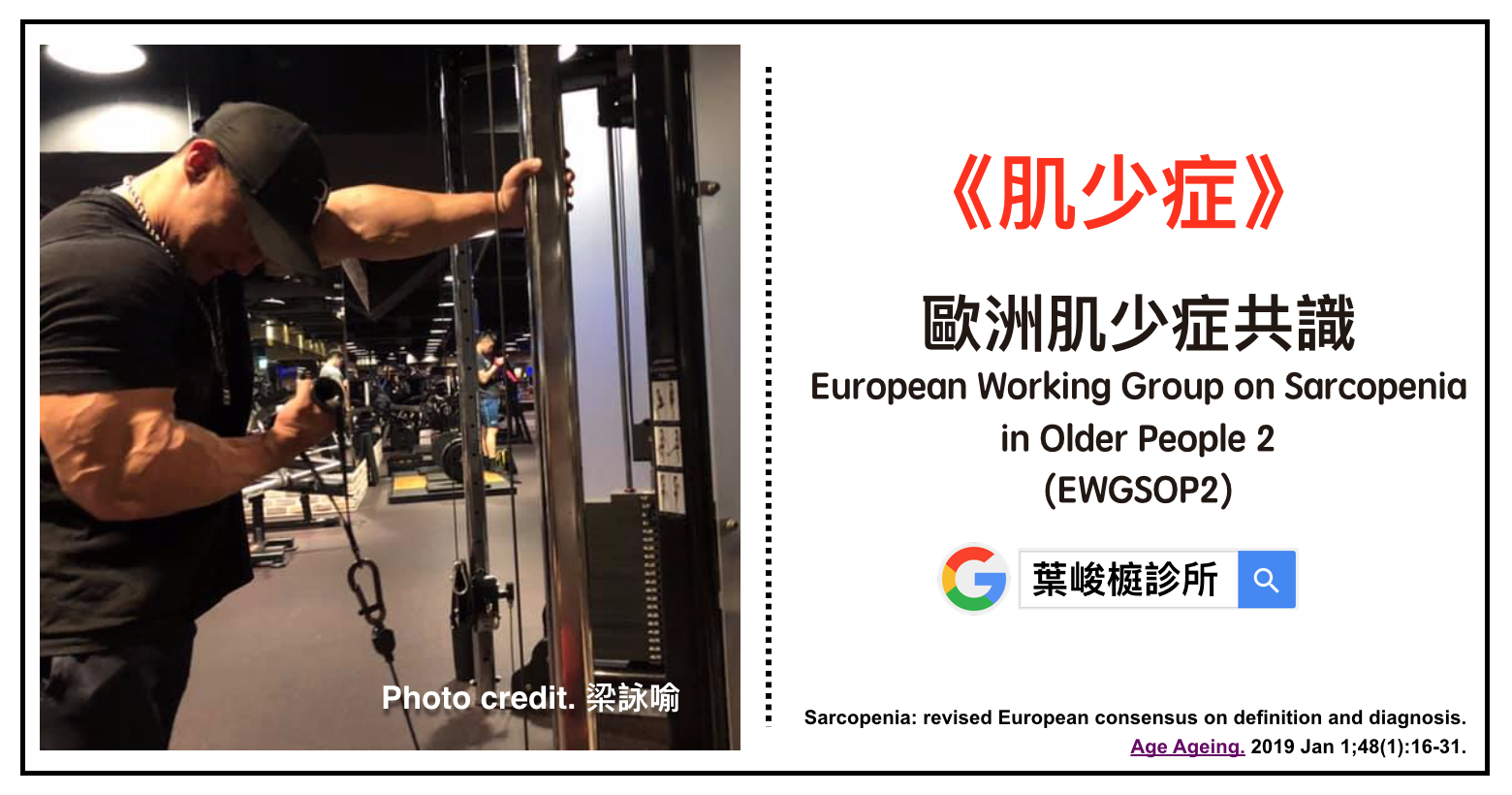 2010 年,歐洲老年肌少症工作小組 (EWGSOP),發表了肌少症指引。2018 年初,此工作小組 (The European Working Group on Sarcopenia in Older People 2, EWGSOP2) 根據過去的研究,再次更新了指引。