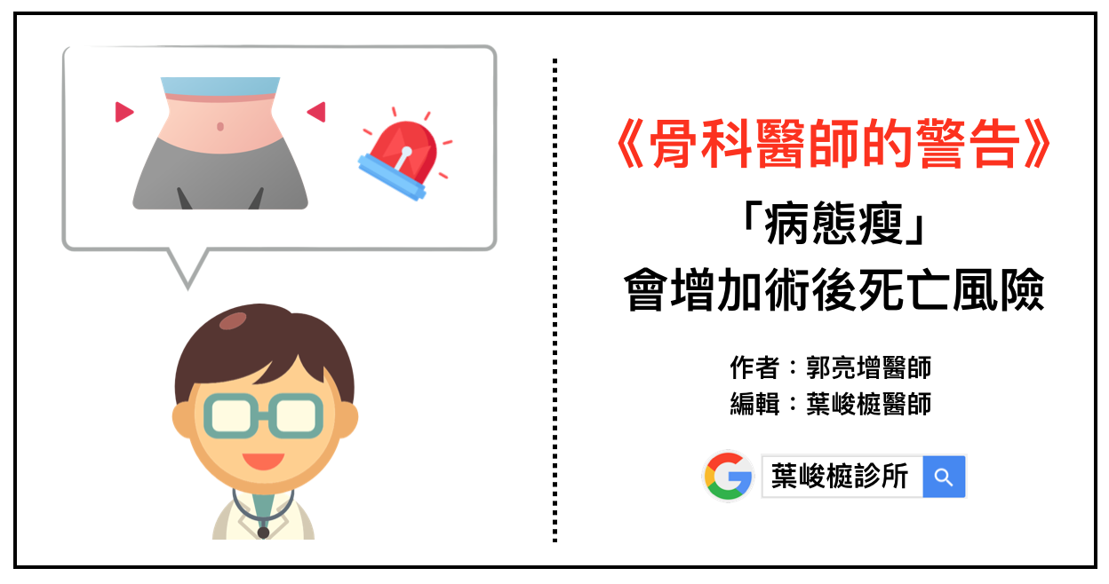 骨科醫師的警告:「病態瘦」會增加術後死亡風險… 1 則留言 / 新陳代謝 (Metabolism), 體重管理 (Weight management) / 葉峻榳 肥胖,容易出現髖關節、膝關節退化問題 ; 臨床上,接受(髖、膝)關節置換手術的病人中,很多也有體重過重的問題。 […] 骨科醫師的警告:「病態瘦」會增加術後死亡風險… 閱讀全文 »